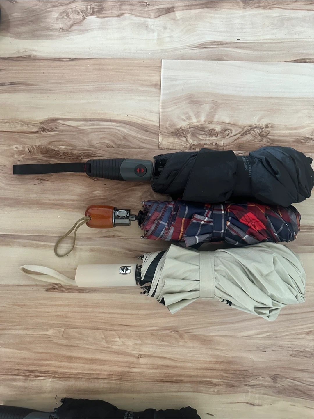 Three compact umbrellas are included. One is black, one has a plaid pattern, and the third is beige. They are all foldable for easy storage. Ready to keep you dry!