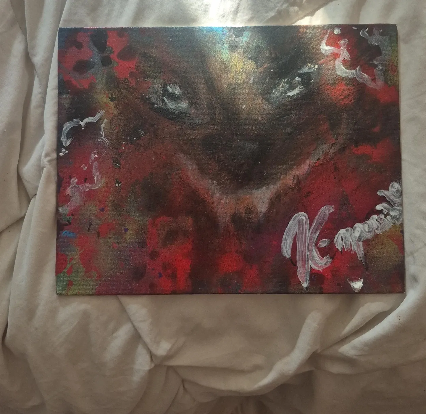 Peinture sur toile représentant un animal aux yeux perçants dans des tons rouges et sombres. Signature de l'artiste présente sur le côté droit. Idéal pour un décor unique.