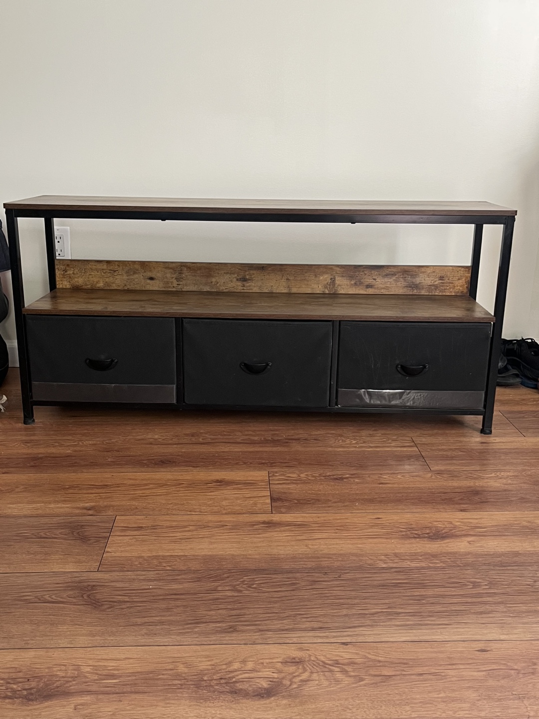 Modern console table. Features a rustic wood top and three fabric drawers. Metal frame. Great for entryway or living room.