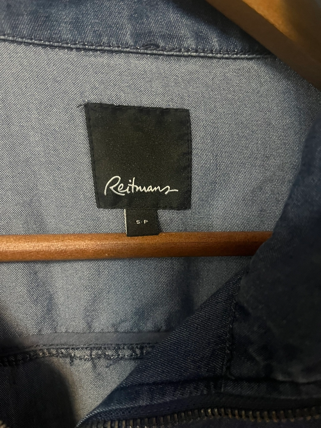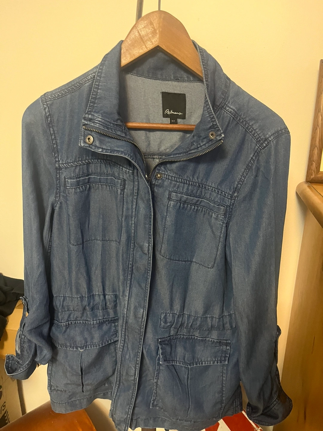 Women's denim jacket. Size small. Features multiple pockets and a zipper closure. Rolled sleeves.