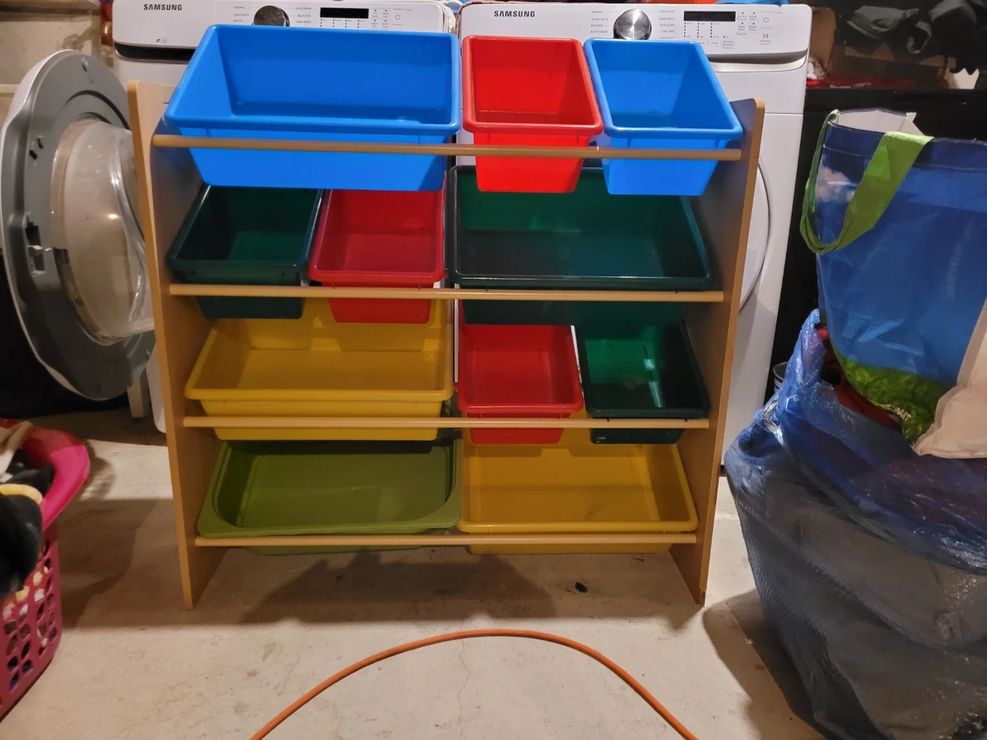 This handy toy storage unit features a sturdy wooden frame and multiple colourful bins for easy organization. It includes blue, red, and green bins in various sizes.