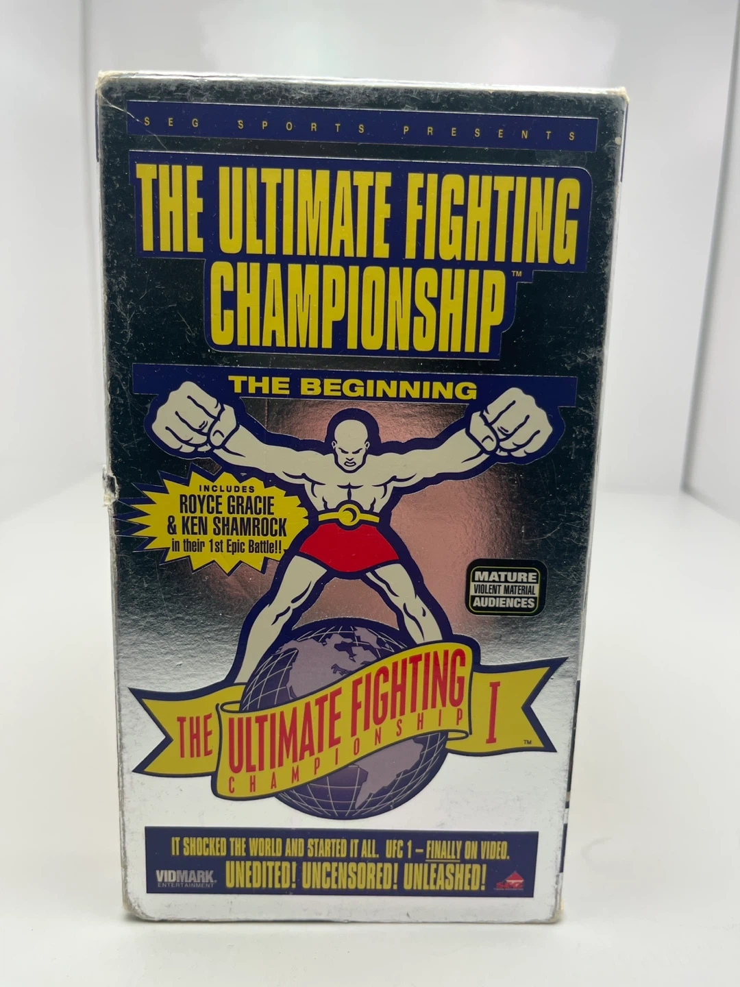 This VHS tape features the inaugural Ultimate Fighting Championship event. It includes fights with Royce Gracie and Ken Shamrock. The tape is approximately 89 minutes long and rated for mature audiences.