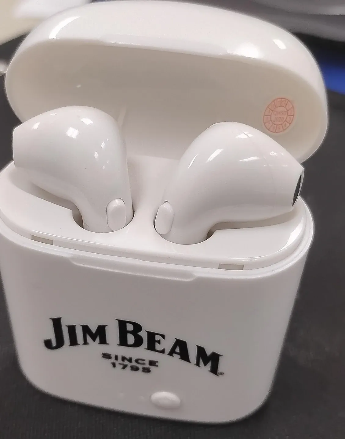 Selling a pair of Jim Beam wireless earbuds. They come in a white charging case with the Jim Beam logo. Great for listening to your favourite tunes on the go!