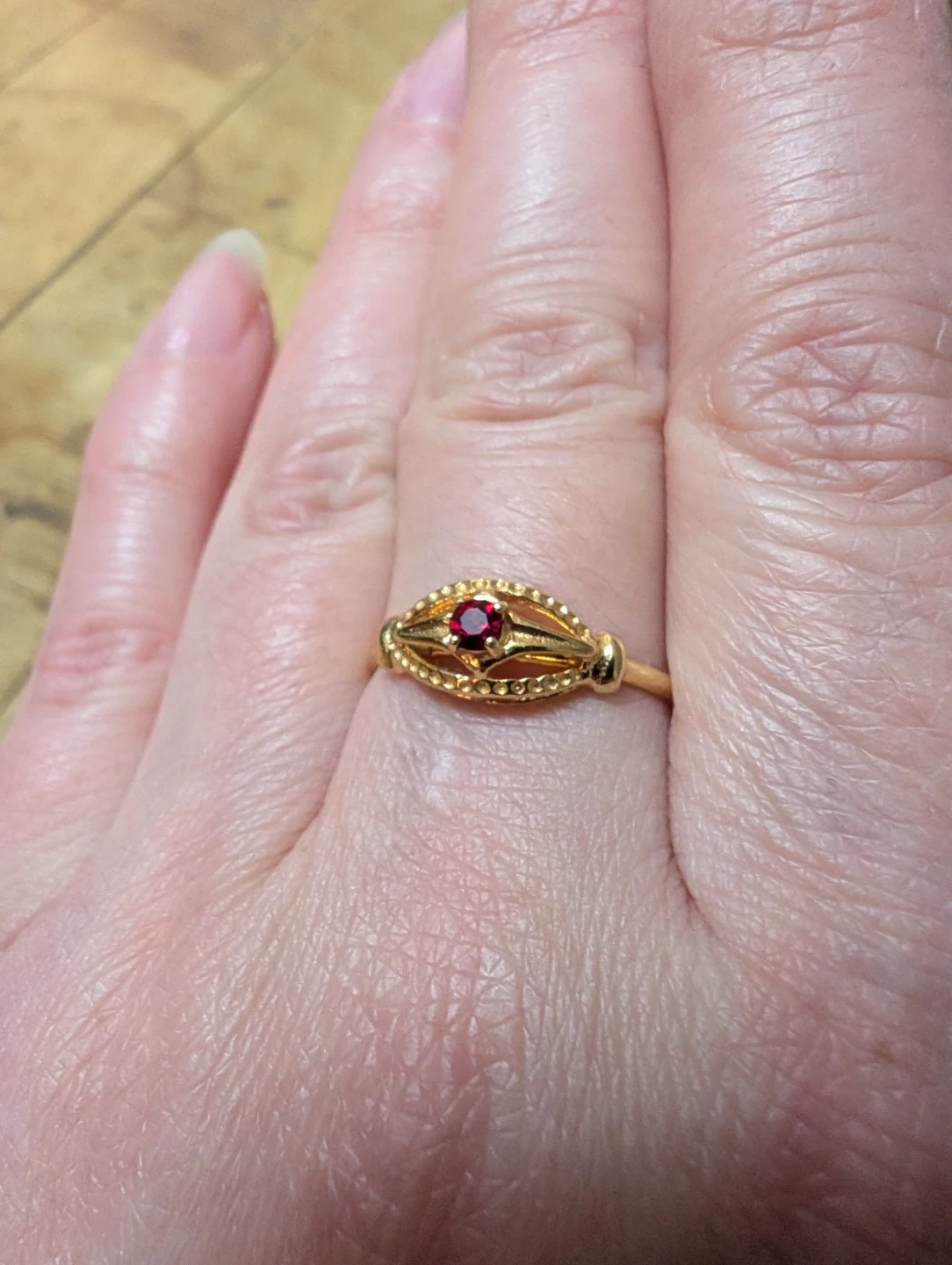 A beautiful Italian 14K gold ring, with a beautiful little ruby and intricate handcrafted detailing. Size 5.5.