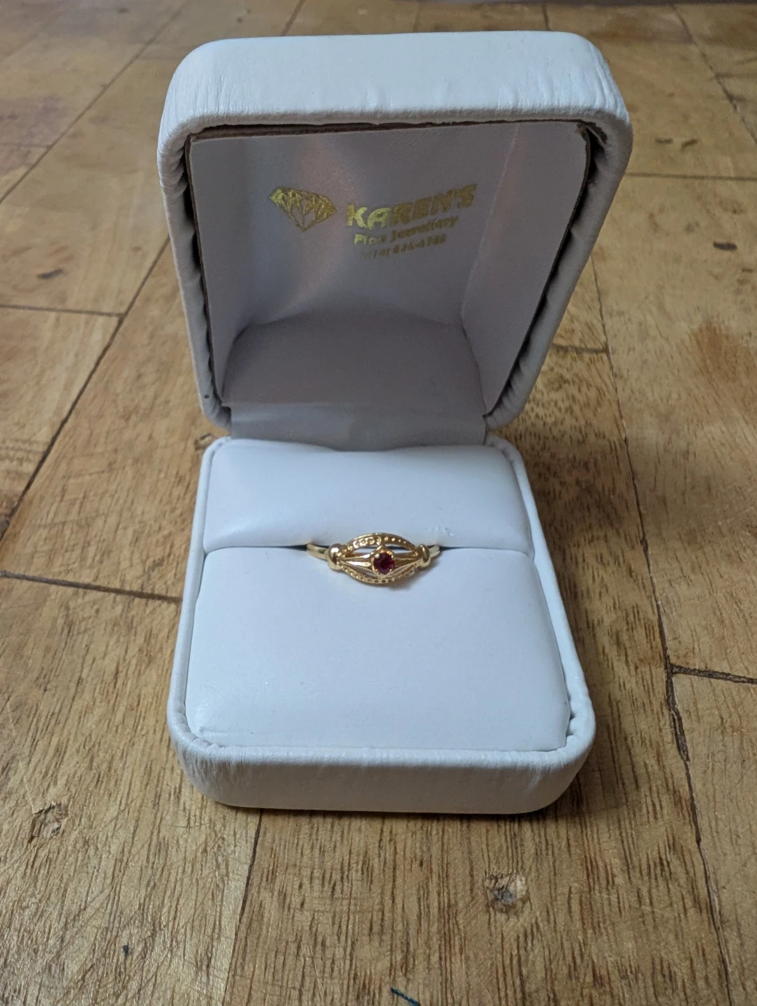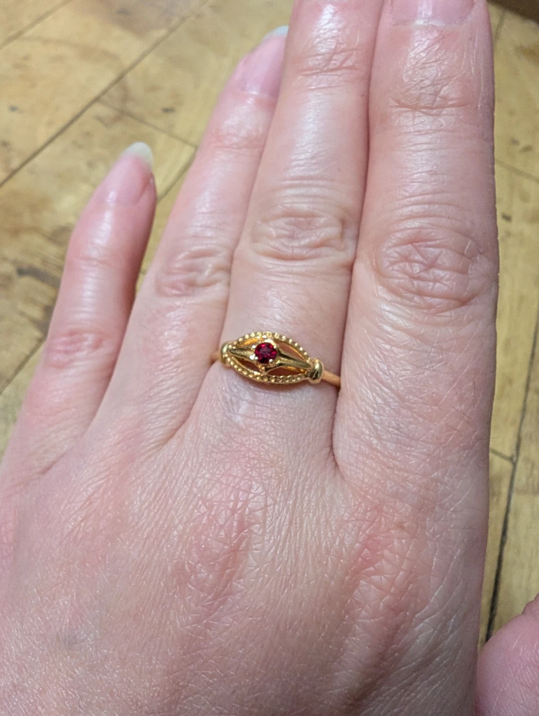 A beautiful Italian 14K gold ring, with a beautiful little ruby and intricate handcrafted detailing. Size 5.5.