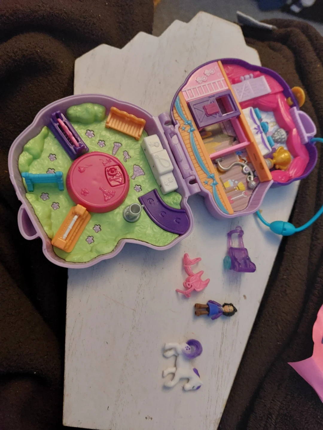 This is a Polly Pocket compact playset with multiple play areas inside. It includes miniature figure, a tiny pony, pink sadle and other accessories. It's a fun toy for imaginative play!