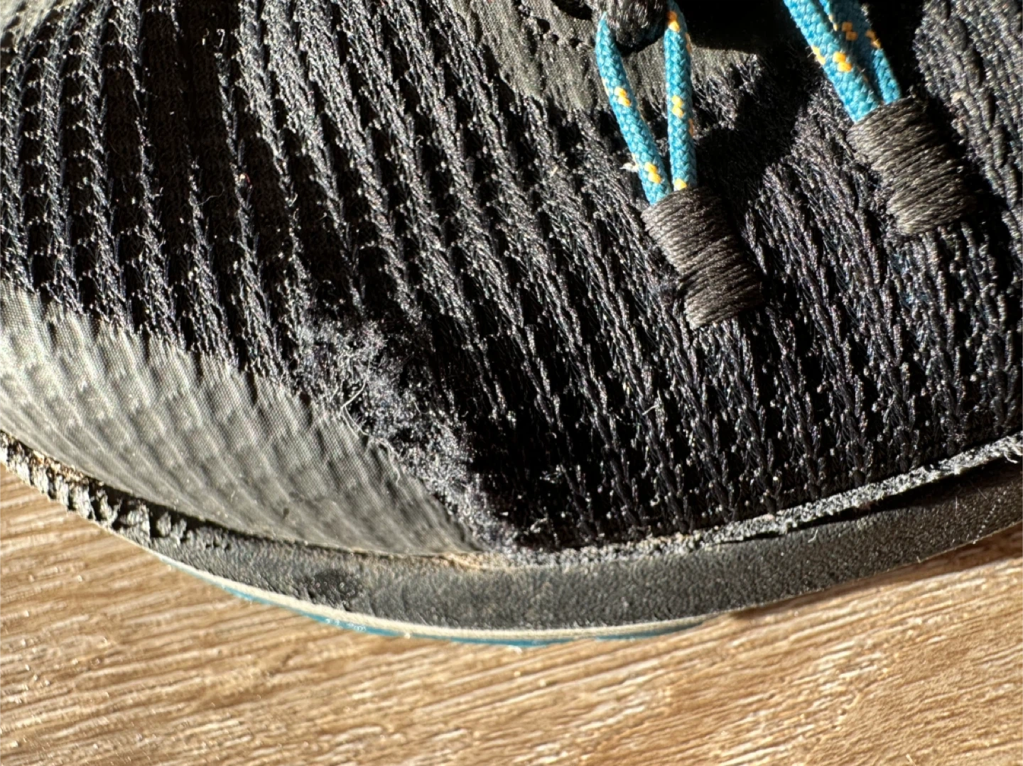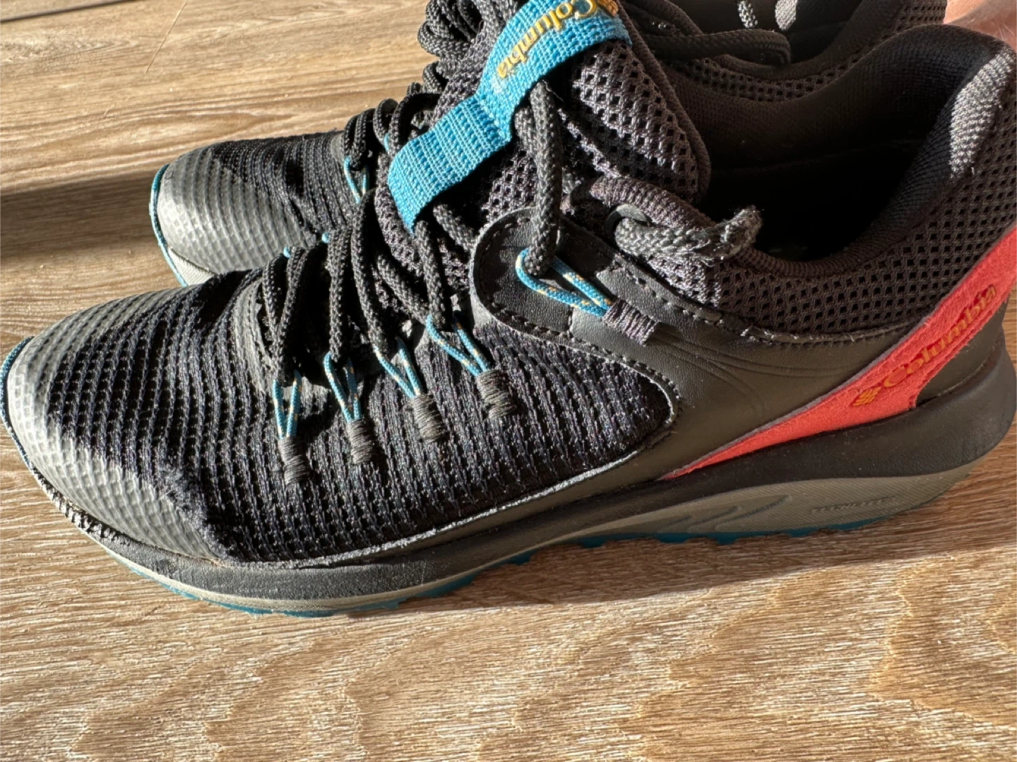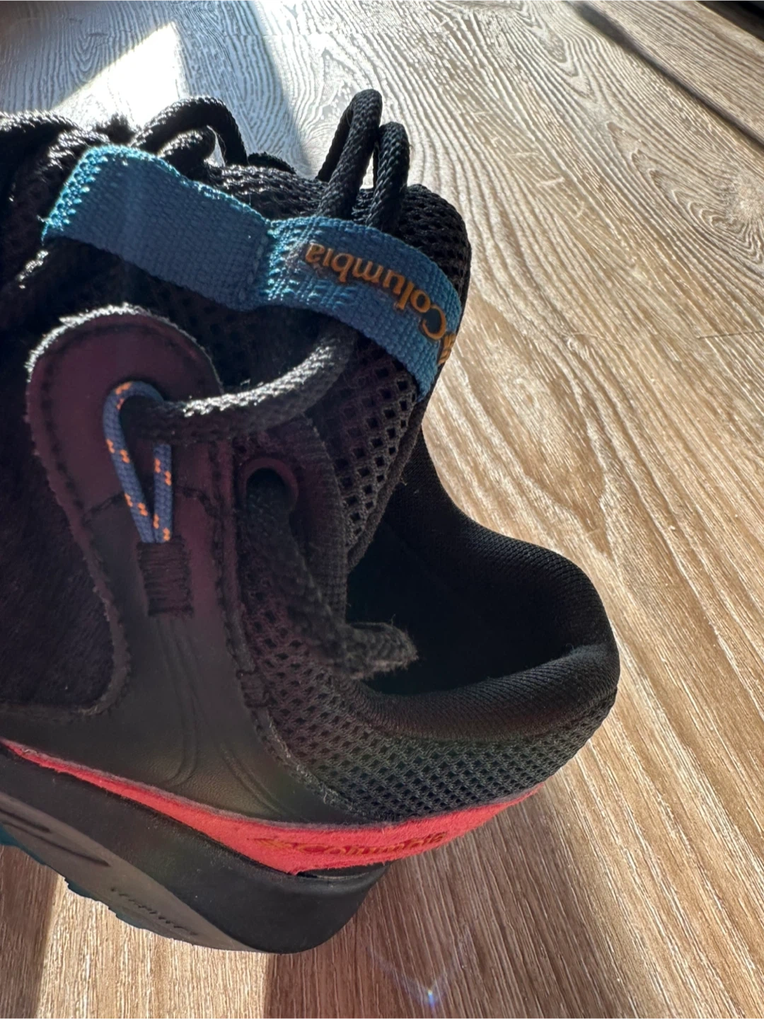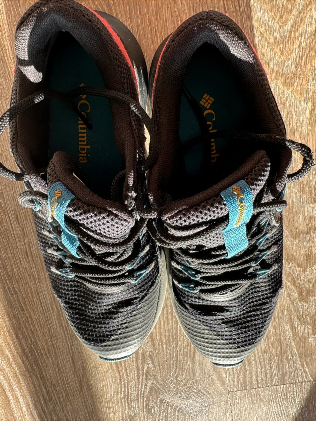 These black Columbia trail running shoes are waterproof. They're made with a mesh upper and have a durable rubber sole. Great for outdoor adventures! Some wear and tear show in pictures