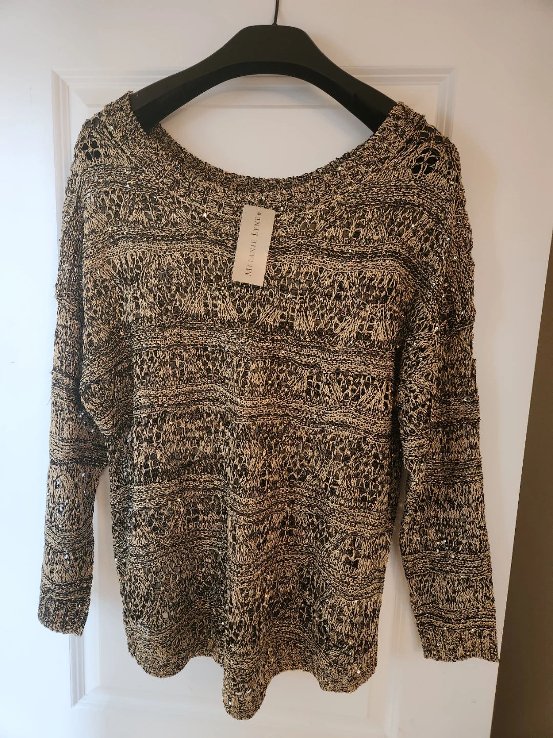 Brand new with tag. Beautiful Melanie Lyne sweater is a size XL. It's a knit with an open weave design and subtle sequin embellishments. Perfect for a present!