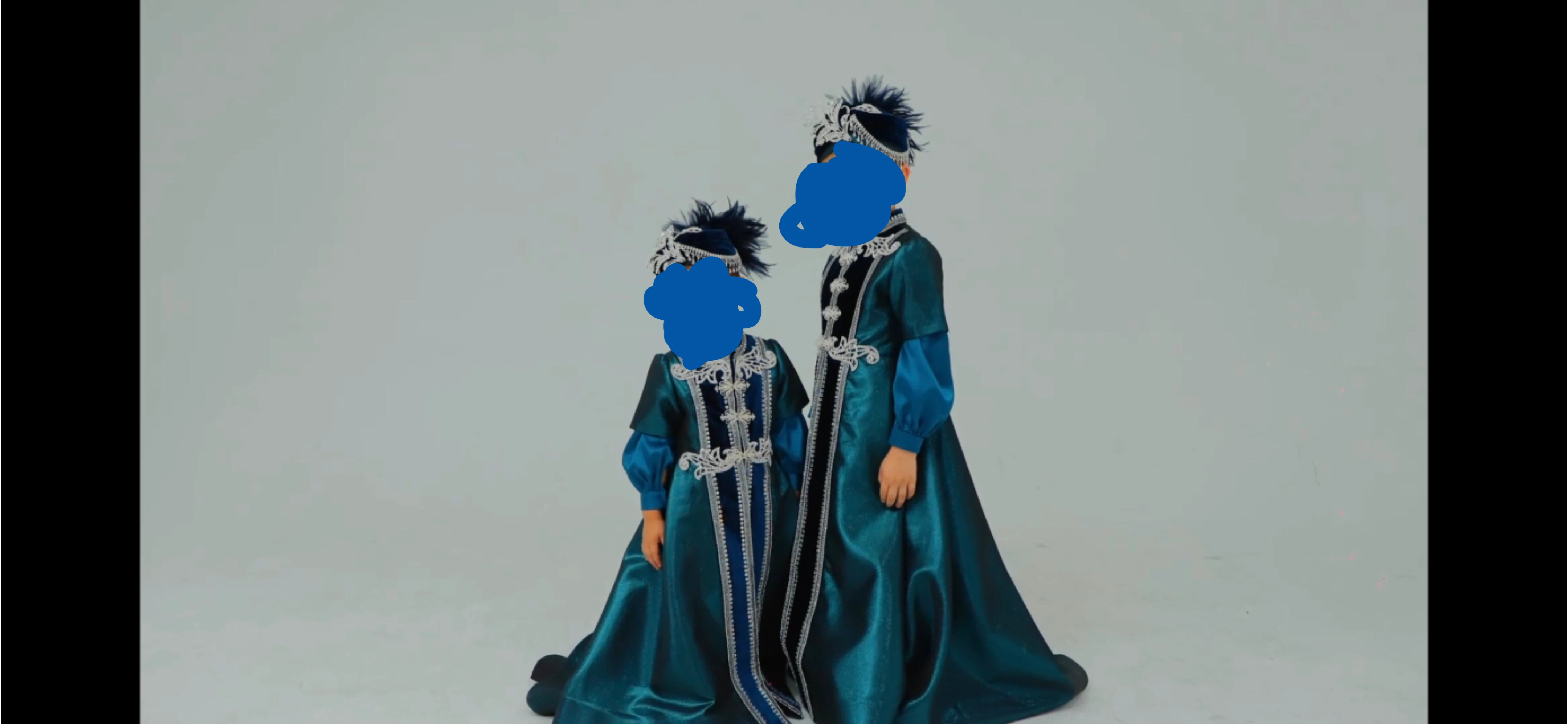 Beautiful teal and blue dresses with intricate silver trim and matching headpieces. These outfits feature long sleeves and flowing skirts, perfect for cultural events or performances. Made from a satin-like material.