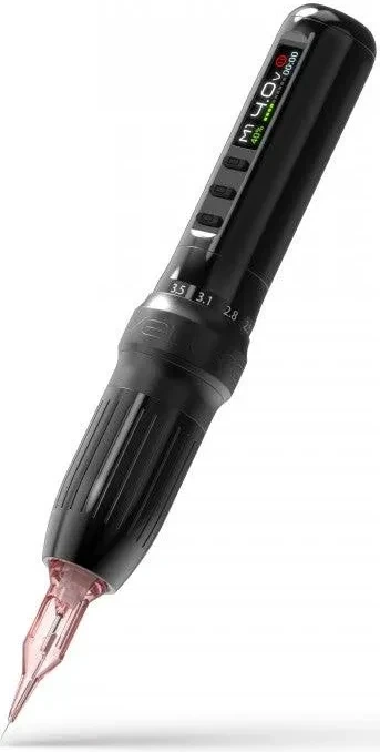 This is a wireless permannt makeup pen. It's black and features adjustable voltage from 2.0V to 3.5V. The machine has a digital display showing voltage and battery life. It includes the pen and a charging cable.