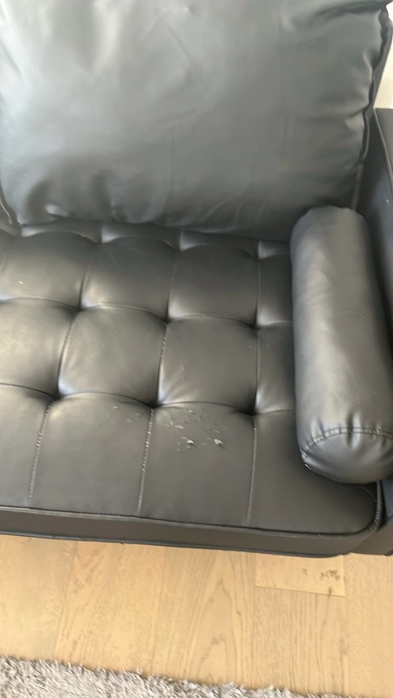 Black faux leather loveseat sofa with tufted seat cushions. Comes with two matching throw pillows and two bolster pillows. Wooden legs add a modern touch. My cat scratched it a couple of times. Otherwise, it's like new.