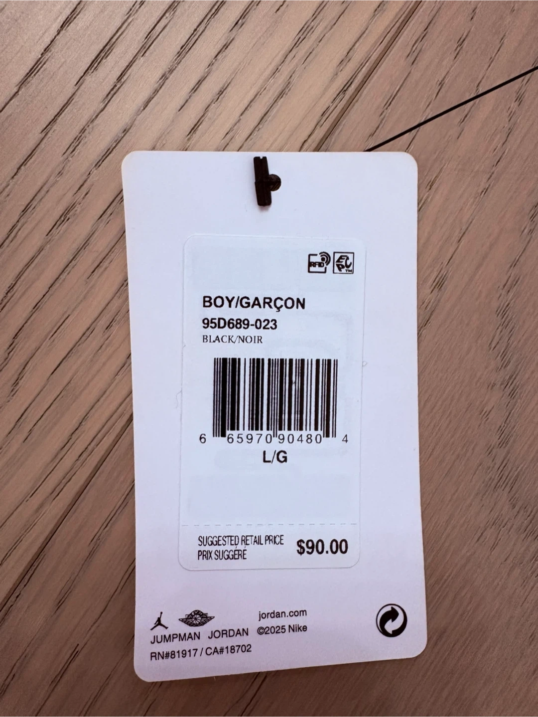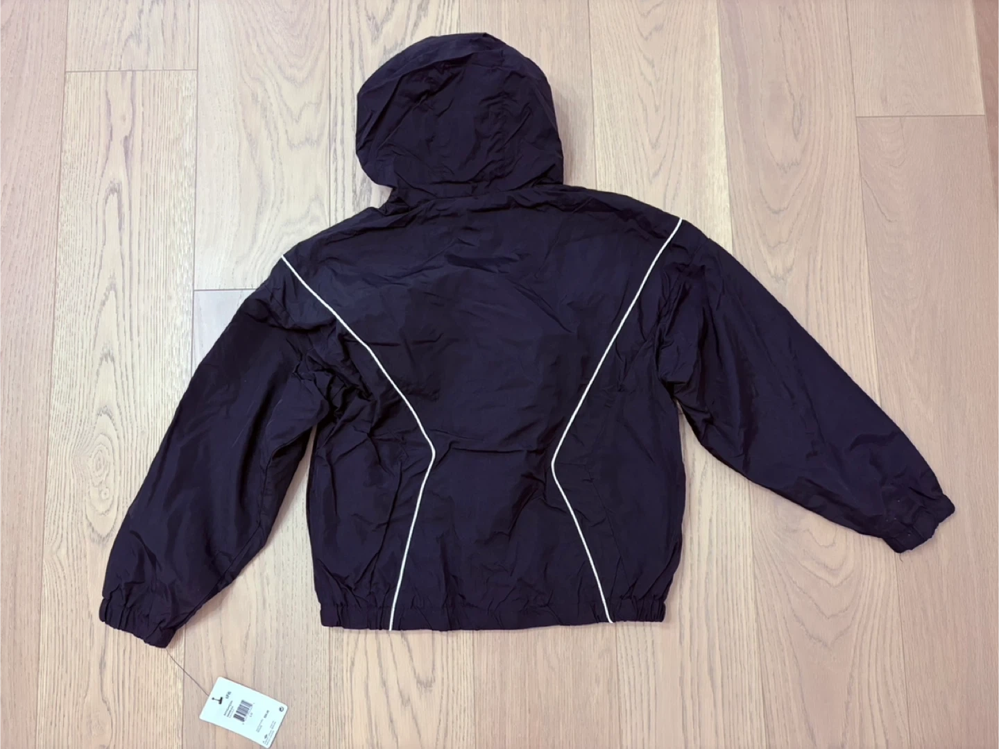 Brand new Jordan hooded windbreaker jacket for boys. It's black with white piping details. Size is Large. 12-13 years old.