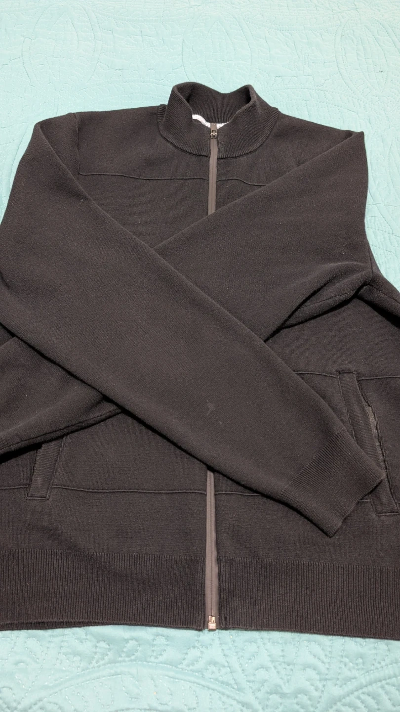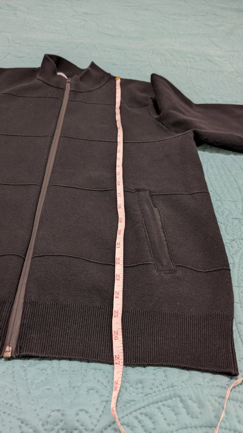 Selling a Roots zip-up cardigan in black. It's in good condition and perfect for layering! The length is approximately 27 inches, and the sleeve length is about 25 inches