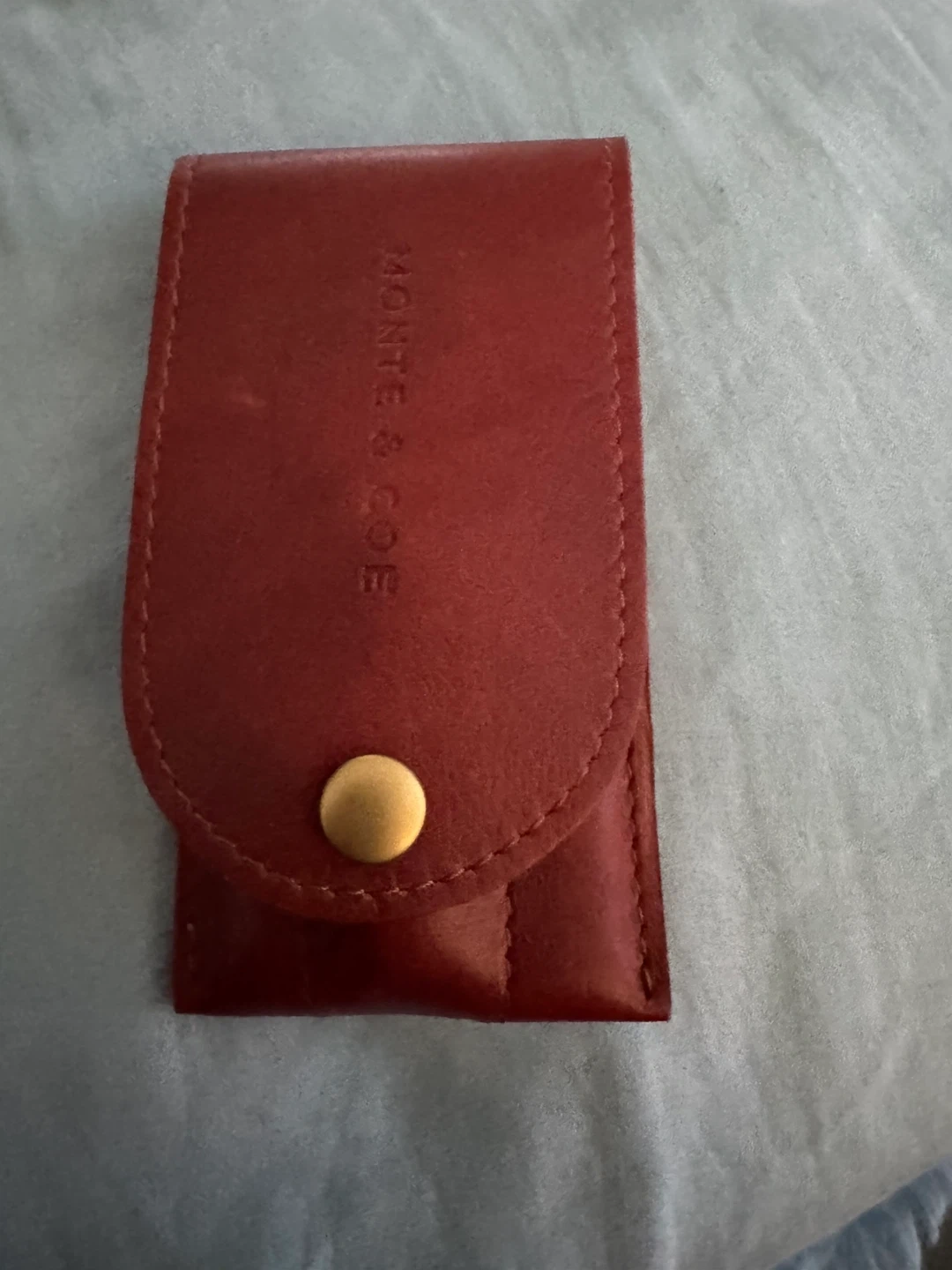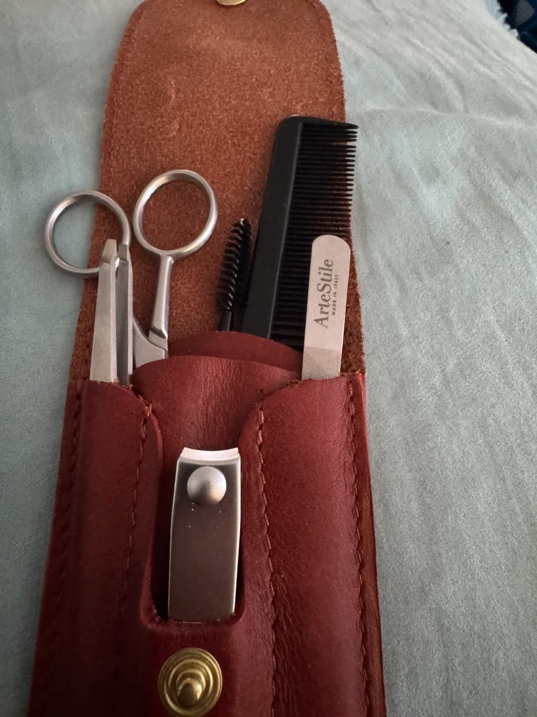 This Monte & Joe grooming kit comes in a brown leather case. It includes scissors, tweezers, a nail clipper, a comb, and a nail file. The leather case has a snap closure.