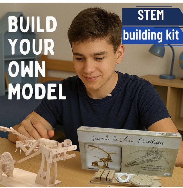 Pathfinders Leonardo Davinci Ornithopter Wood Kit by Pathfinders Build Your Own Ornithopter. The ornithopter was one of Leonardo's masterful designs. Still extremely cool, however, in this kit version. Pre-cut, unpainted wooden pieces assemble with pegs to make a crank-operated moving model with a 24" wingspan, complete with a human figure.