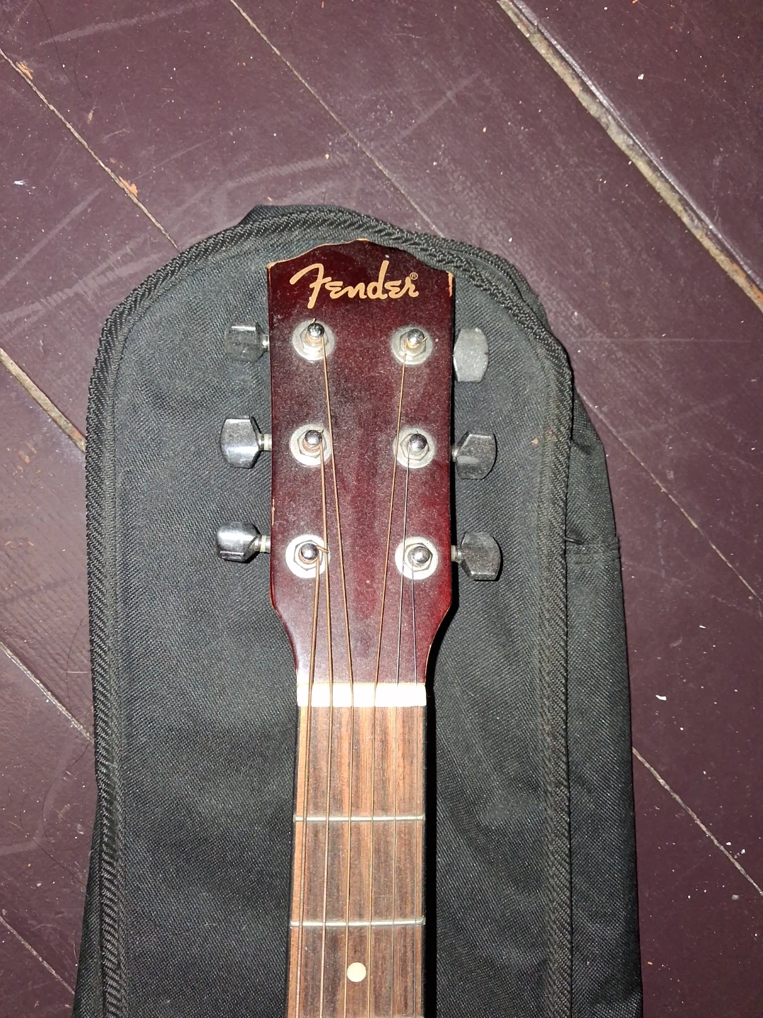 Used Fender FA100 acoustic guitar. Natural wood finish. Includes a black bag. The guitar body is adorned with several stickers.