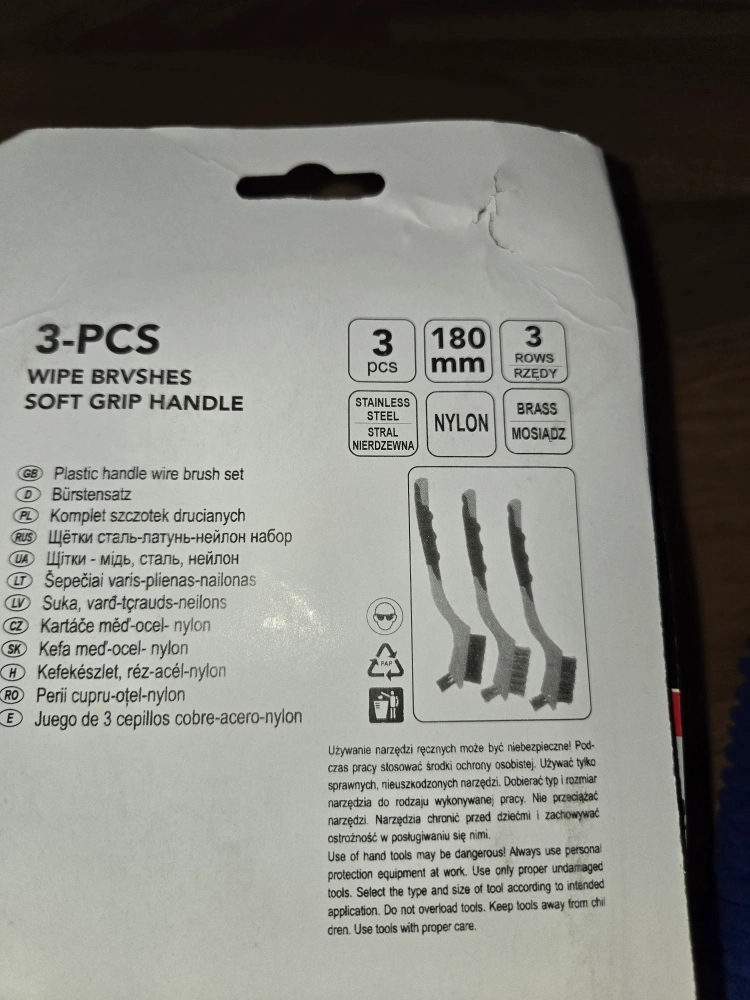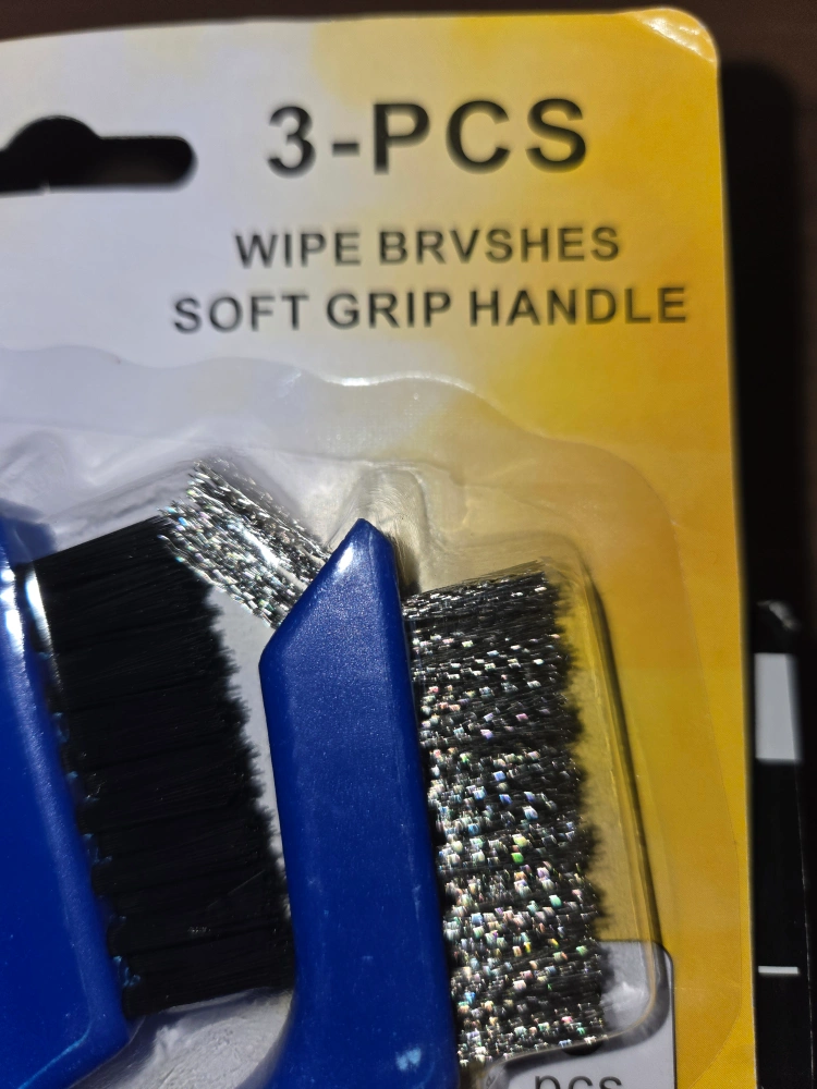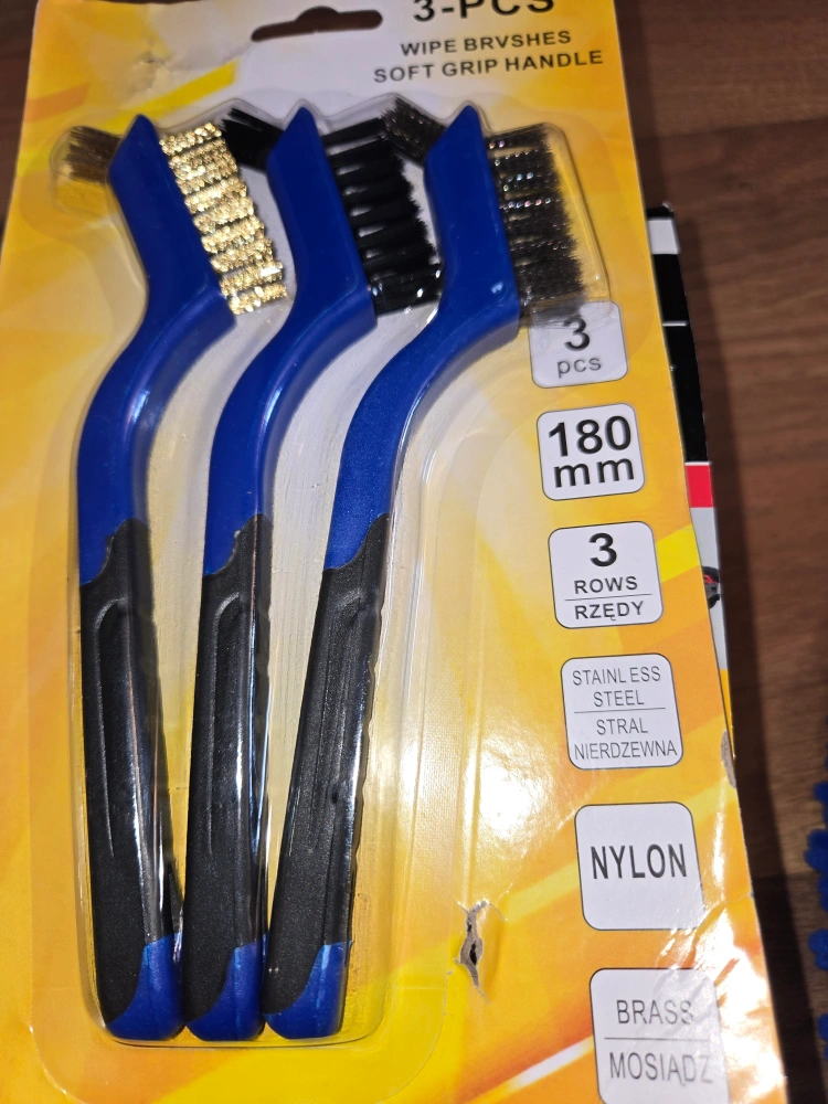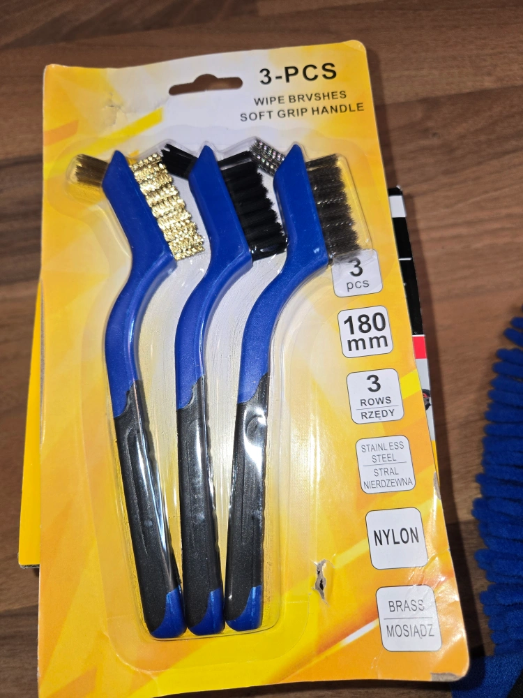 Selling a pack of 3 wipe brushes with soft grip handles! These brushes feature stainless steel, nylon, and brass bristles. Each brush is 180mm in length and has 3 rows of bristles. They're perfect for various cleaning tasks around the house or garage