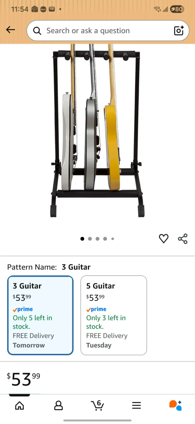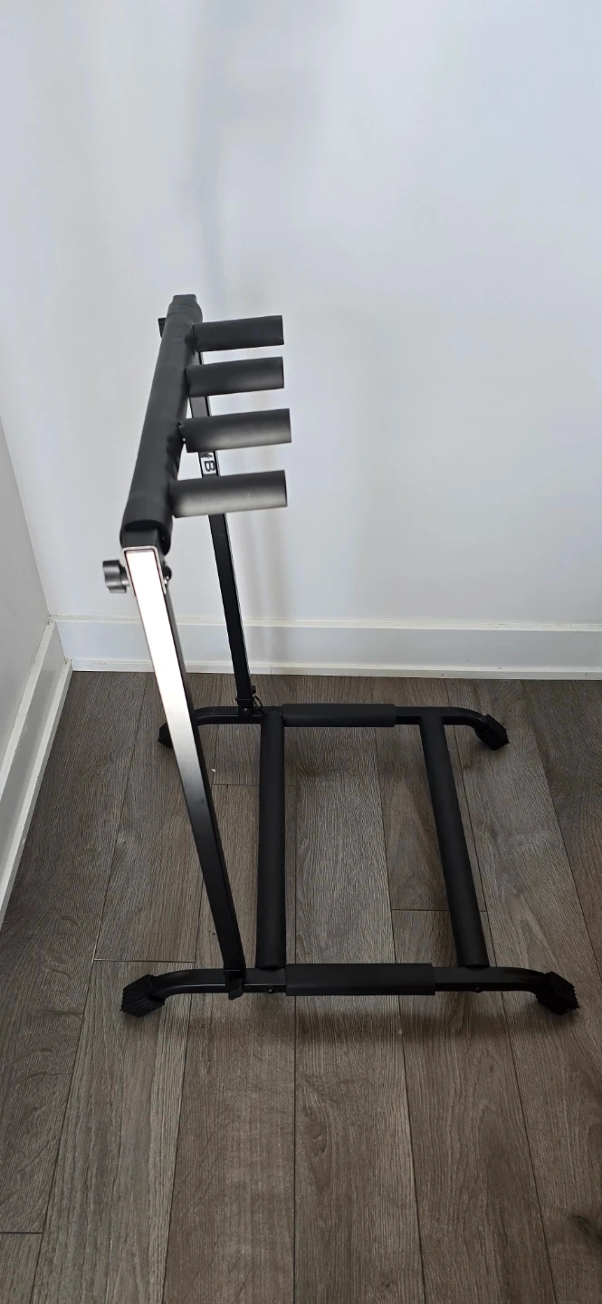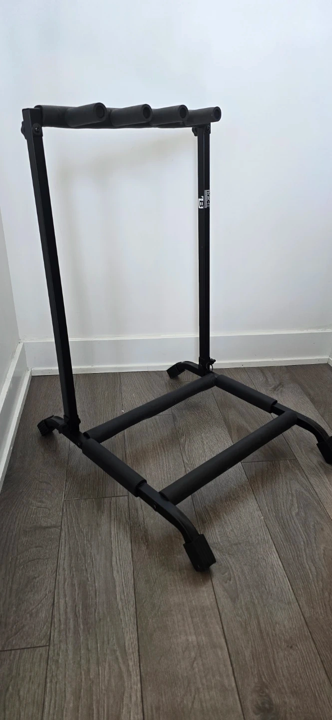 Black metal guitar stand designed to hold three guitars. It's foldable for easy storage and transport. The stand has padded arms to protect your instruments.