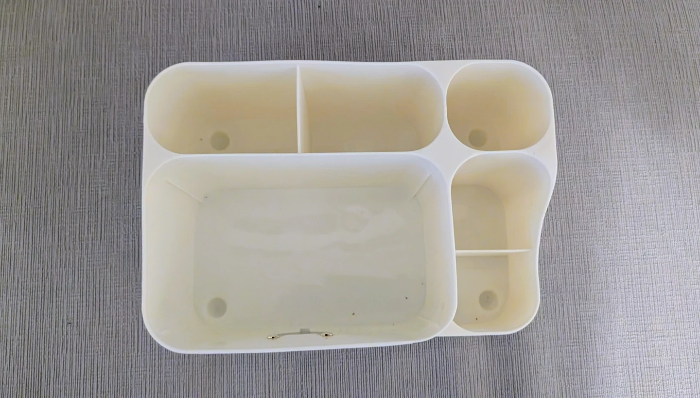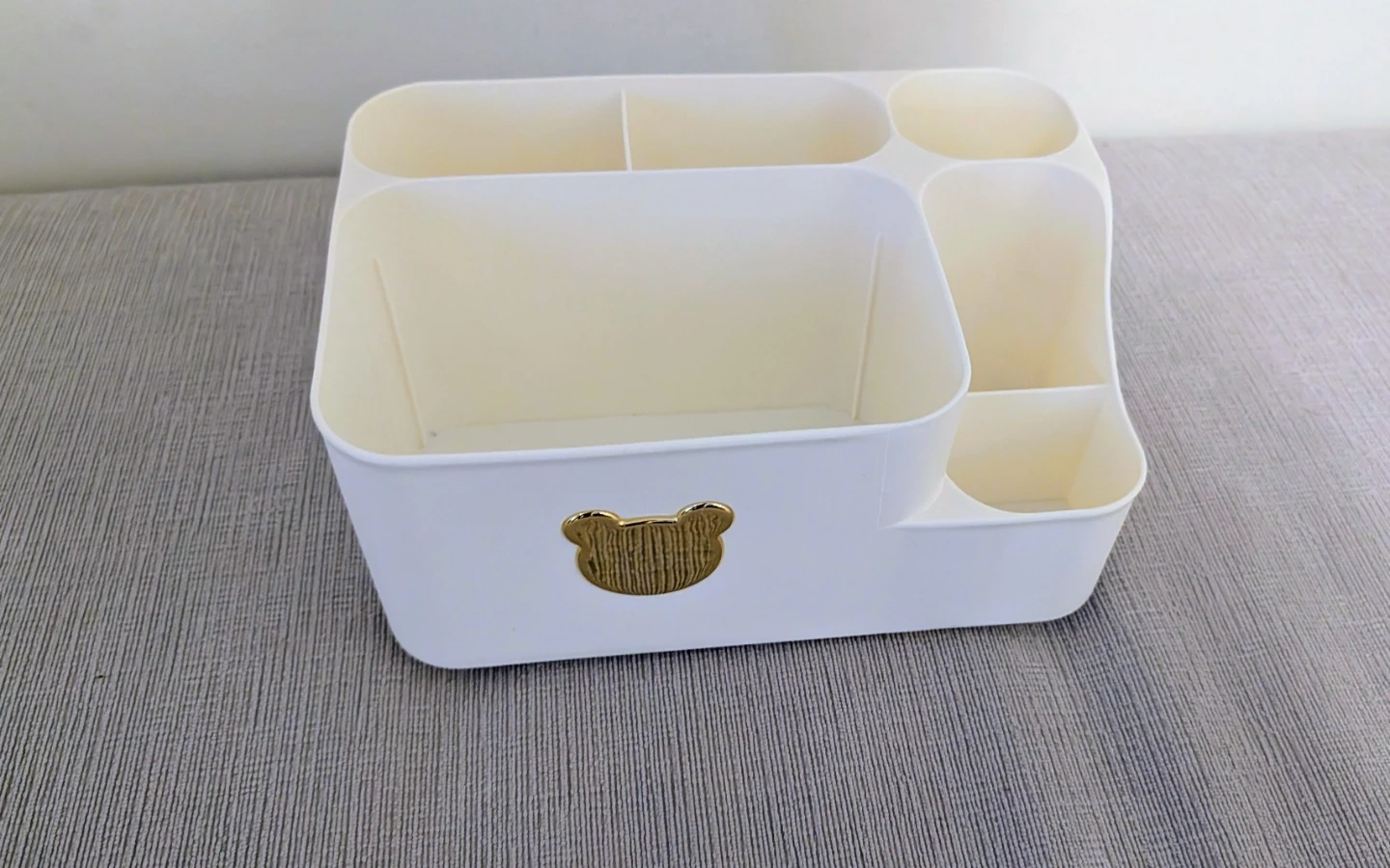 This white desktop organizer features multiple compartments for various items. It has a prominent bear emblem on the front. Plastic material.