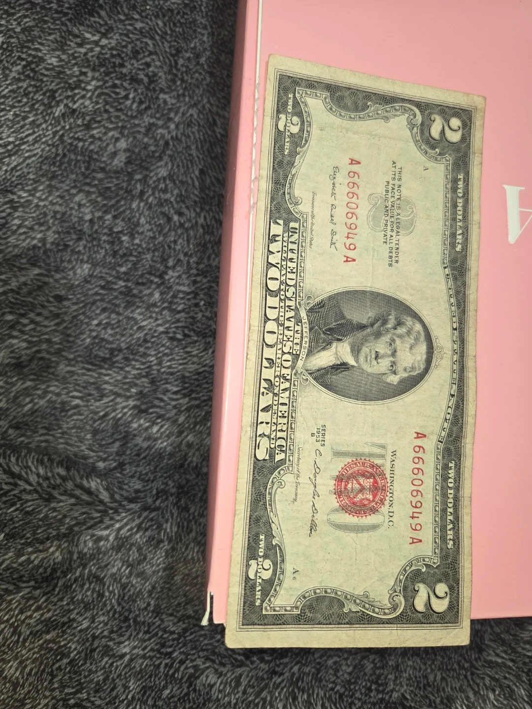 A 1953 United States two-dollar bill. Features Thomas Jefferson on the obverse and Monticello on the reverse. This is a piece of American currency history.