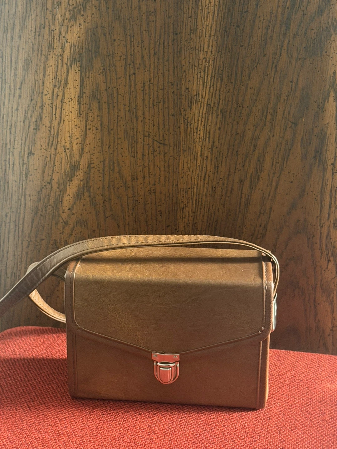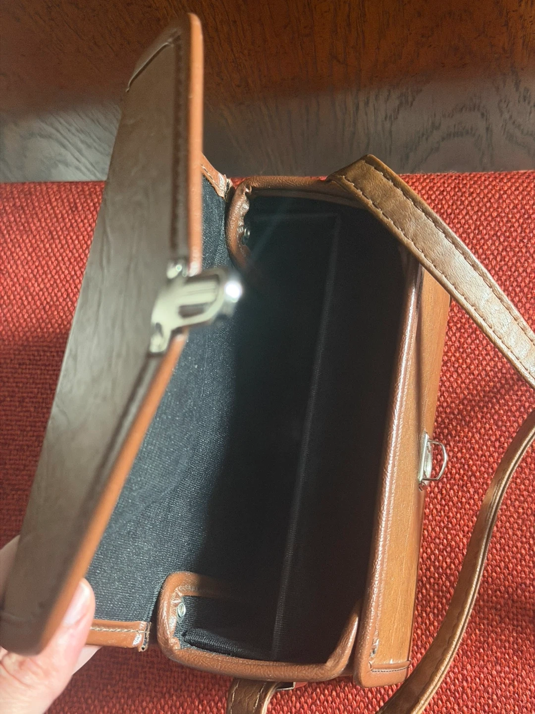 This small bag is made of brown faux leather. It features a metal clasp closure and an adjustable strap. The interior is lined with black fabric.