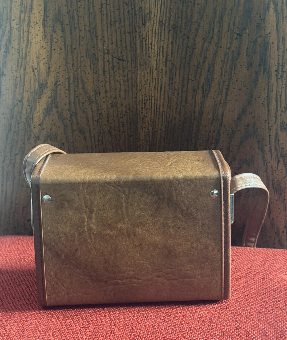 This small bag is made of brown faux leather. It features a metal clasp closure and an adjustable strap. The interior is lined with black fabric.