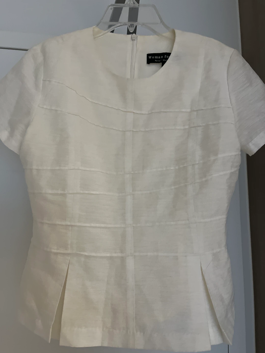 This is a stylish ivory top from Woman for Paris / Italy. It features a textured pattern and a pleated hem. It's made of a linen blend fabric.