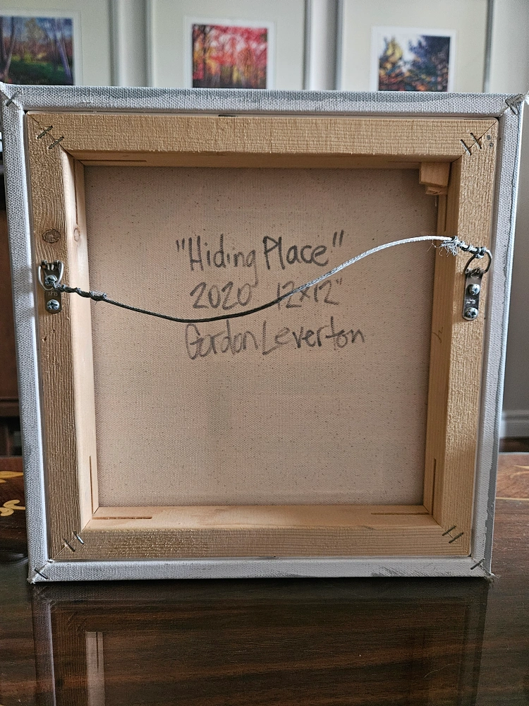 0Original painting titled "Hiding Place" by Gordon Leverton. It's a lovely piece, sized at 12x12 inches. The painting was created in 2020.