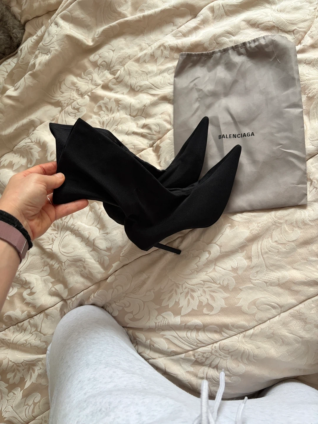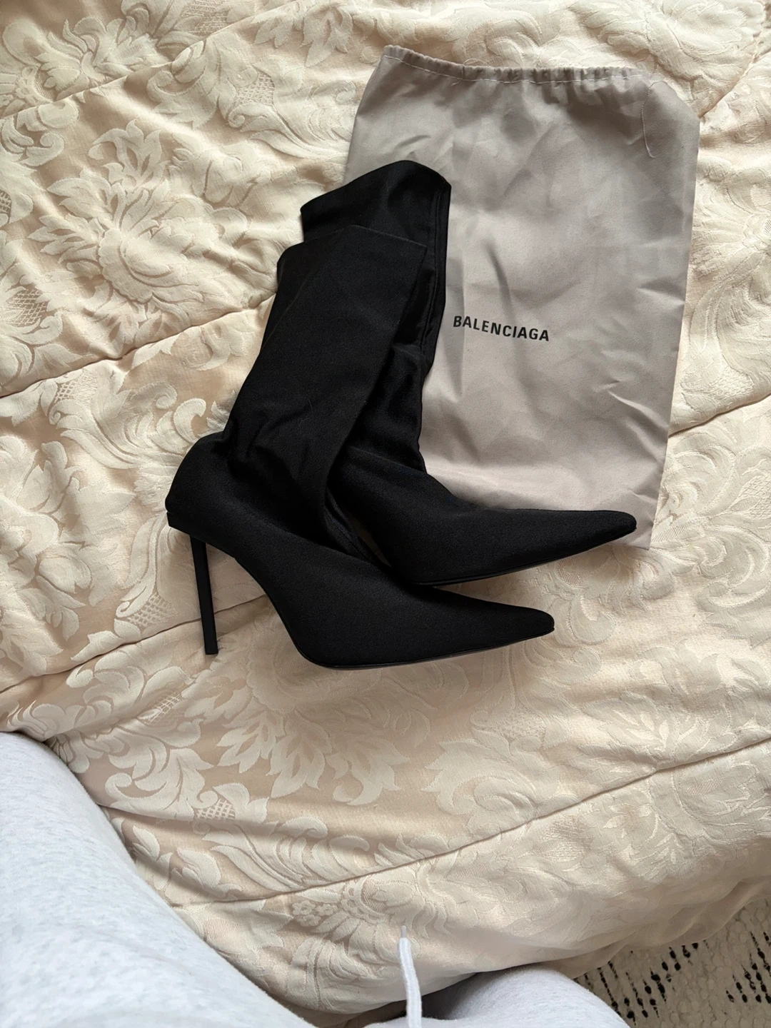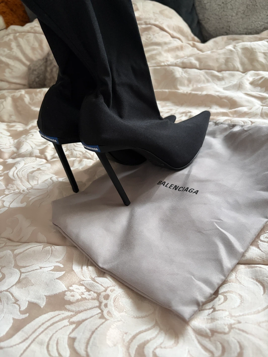 These Balenciaga black stiletto sock boots feature a sleek, form-fitting design. They come with a Balenciaga dust bag. The boots are made of a stretchy fabric material for a comfortable fit.