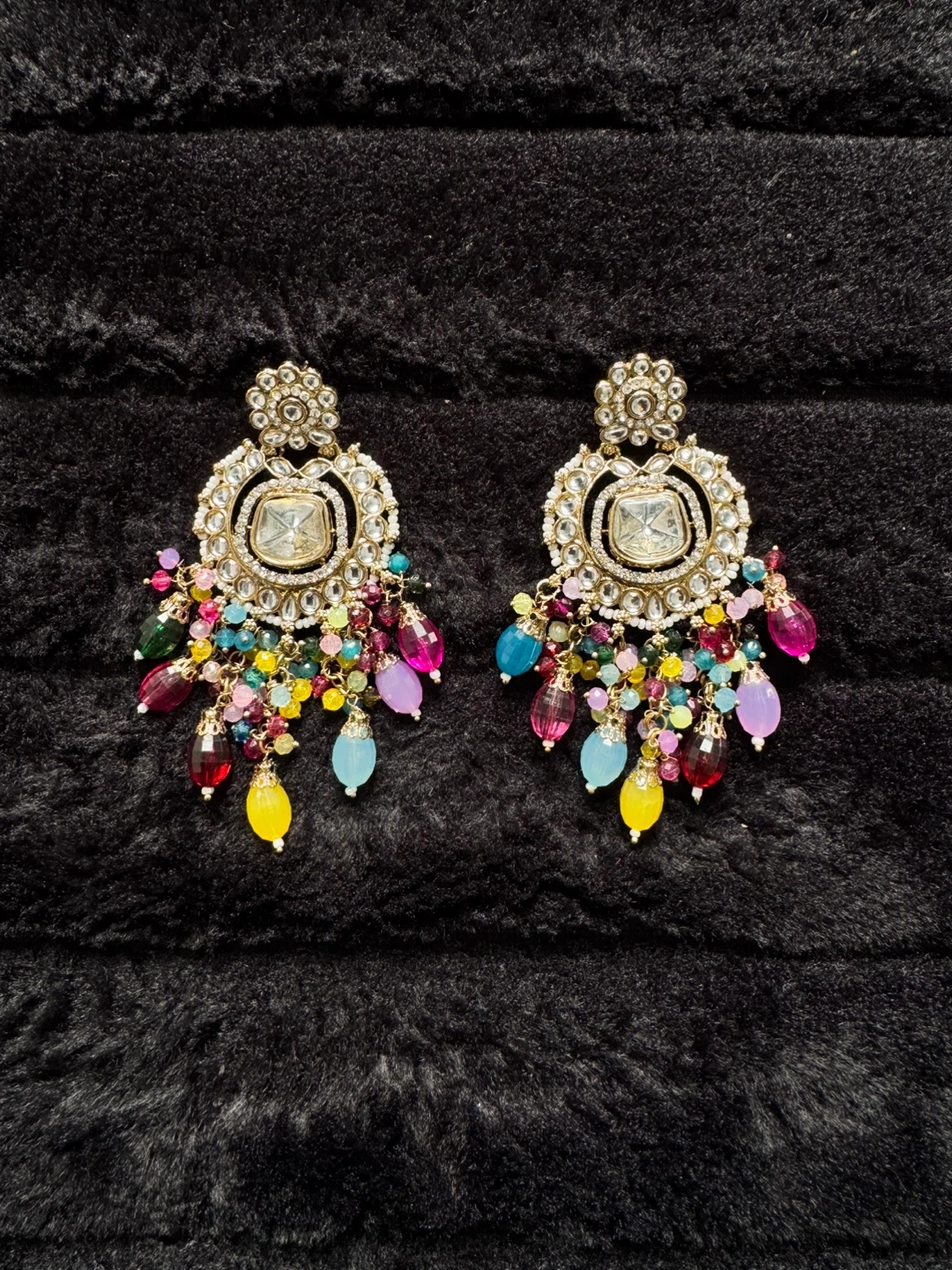 These statement earrings feature a central clear stone surrounded by a decorative metal base. They're adorned with multiple strands of colourful beads in various shapes and sizes. Perfect for adding a pop of colour to any outfit!
