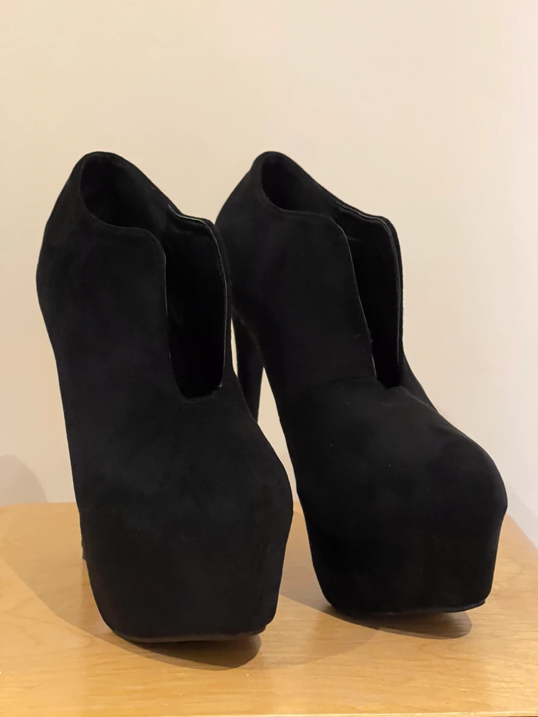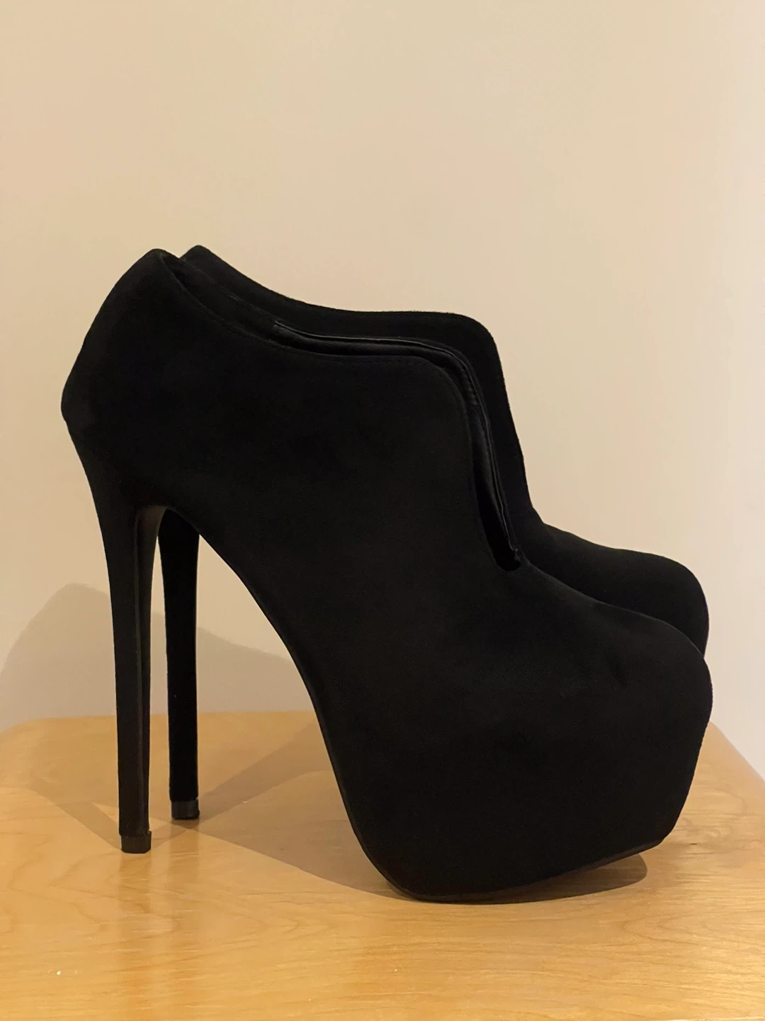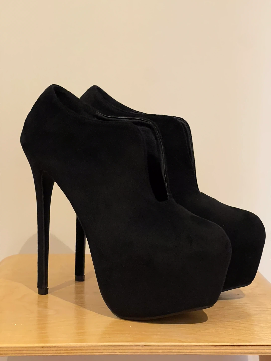 Selling a pair of black suede platform high heel booties. BRAND NEW NEVER WORN. Size 45 would be 11.5/12 MEN Pick up at Yonge and Sheppard Cash only