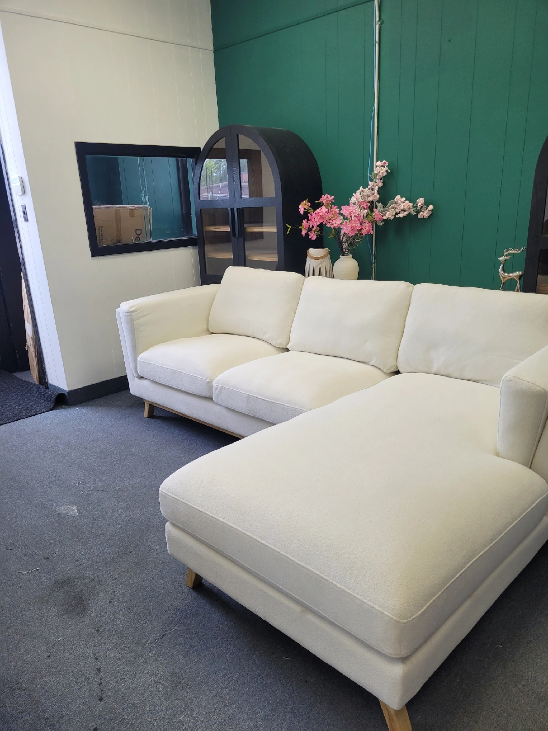 143Selling a comfy white sectional sofa. It's in great shape and would look lovely in any living room! The neutral colour makes it easy to match with any decor. It's perfect for lounging and relaxing after a long day. Feel free to reach out if you're interested