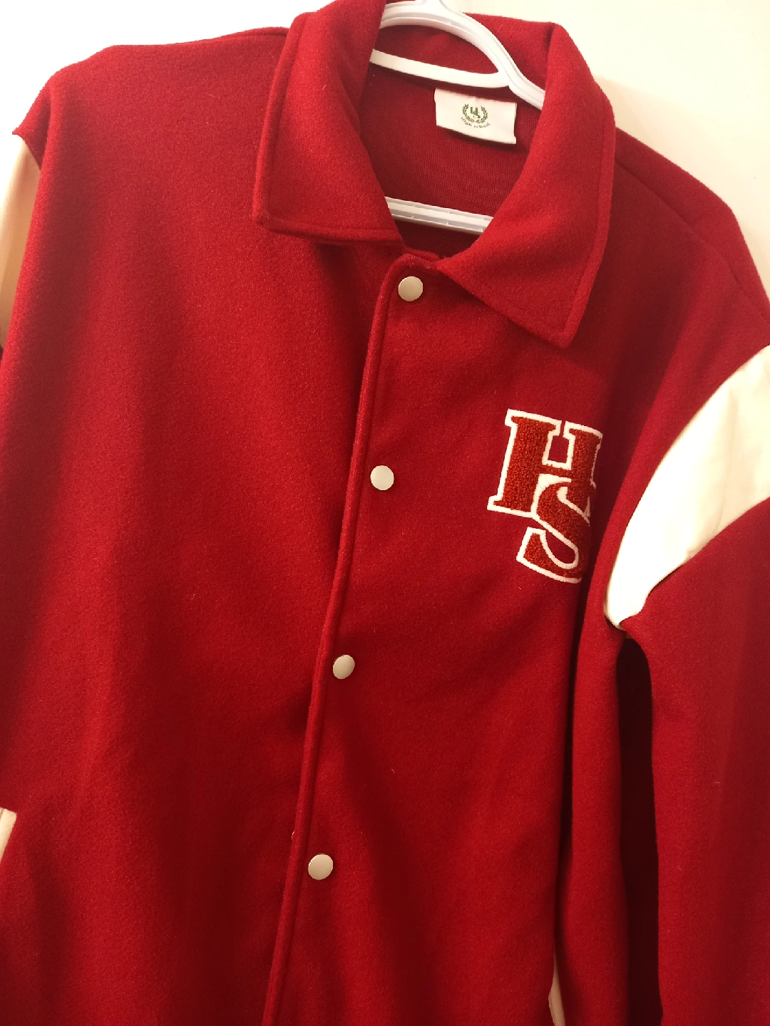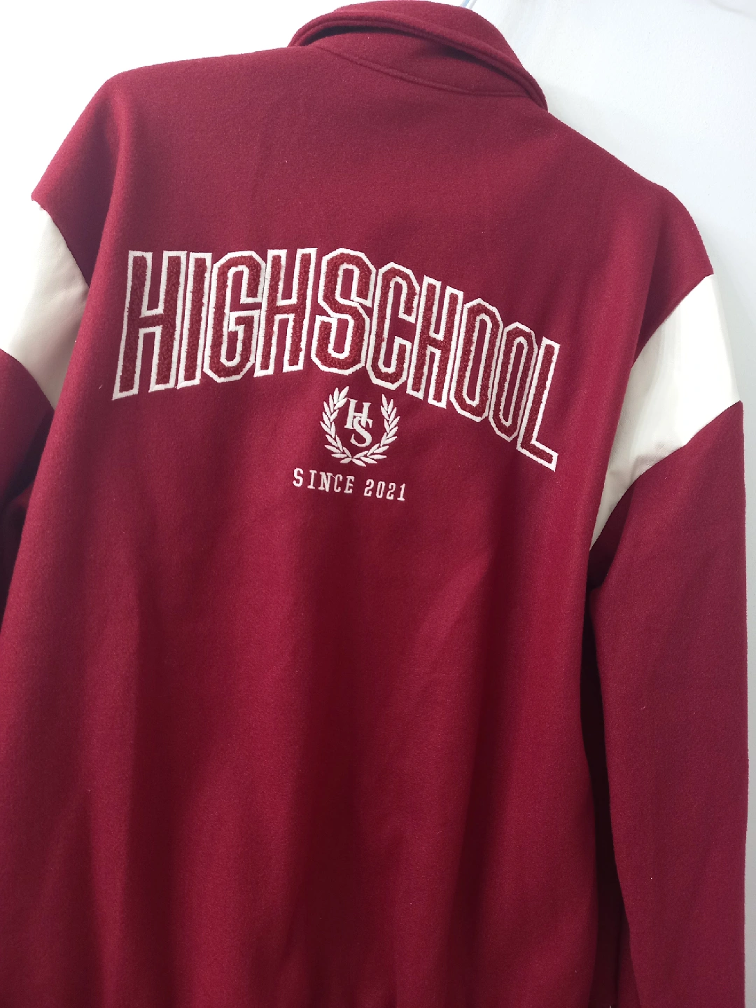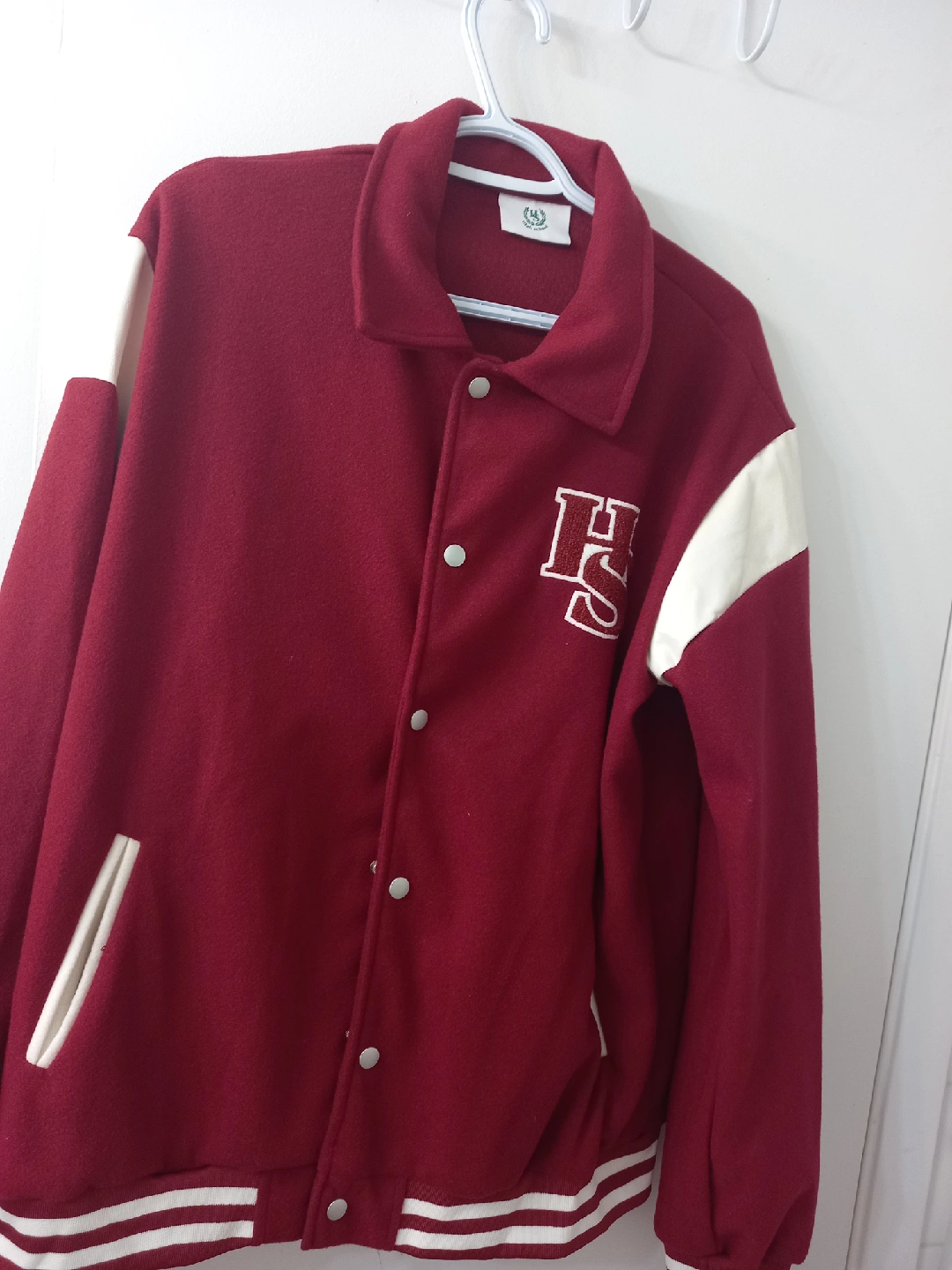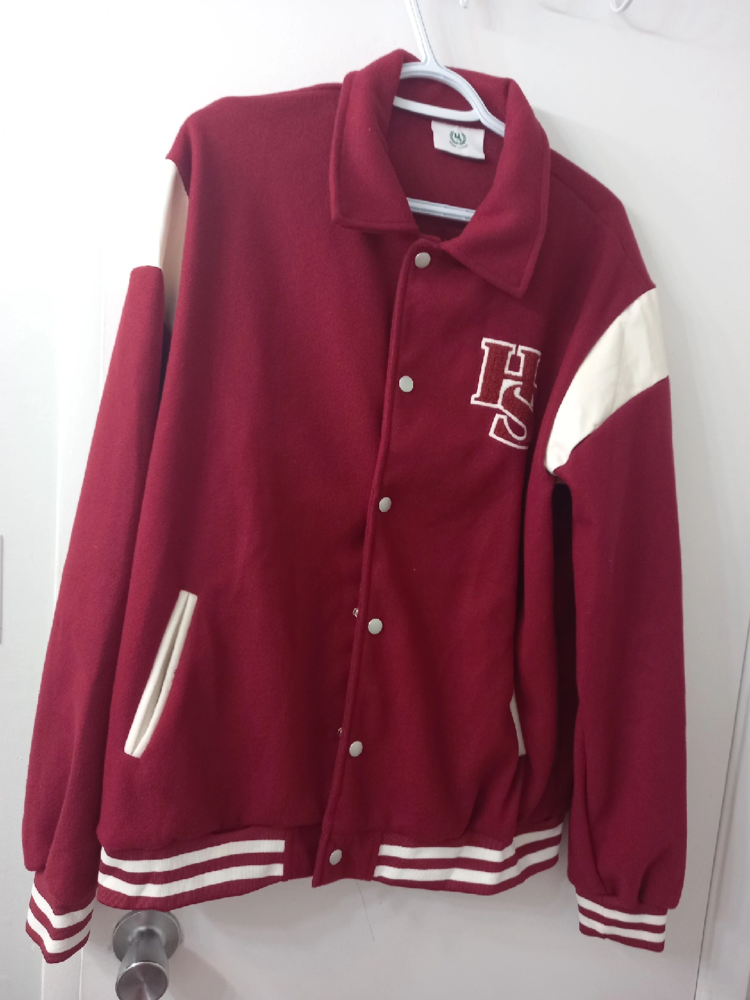20Selling a maroon and white varsity jacket with 'High School' embroidered on the back. The back also says 'Since 2021'. It's in great condition and ready for a new home