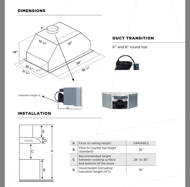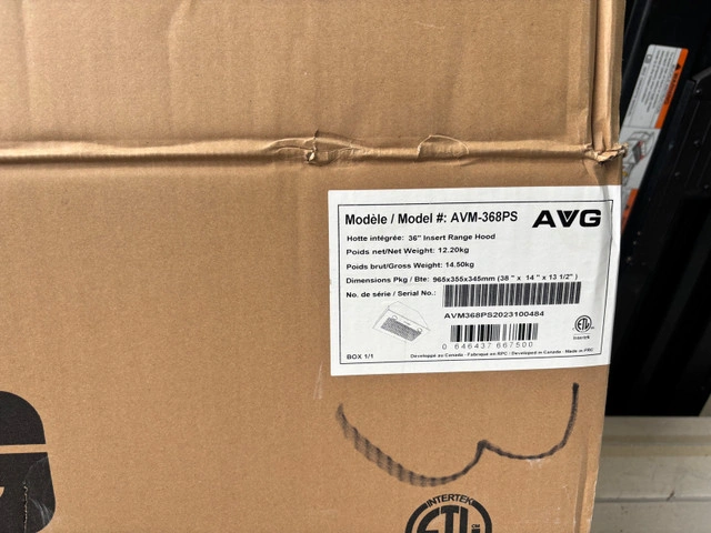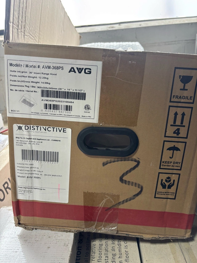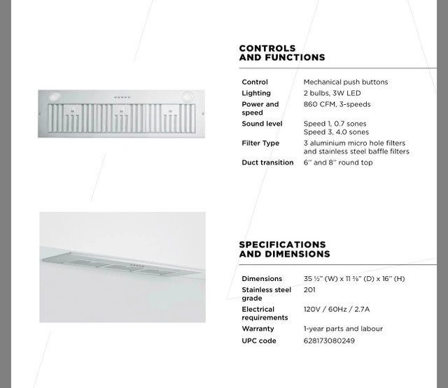 Aviva Cabinet Insert, 36 inch Exterior Width, 860 CFM, Outside / Ducting, LED, Dishwasher Safe Filters, Aluminum Mesh & Baffle Filter, Stainless Steel colour. Brand new sealed in box. For Sale By: Owner