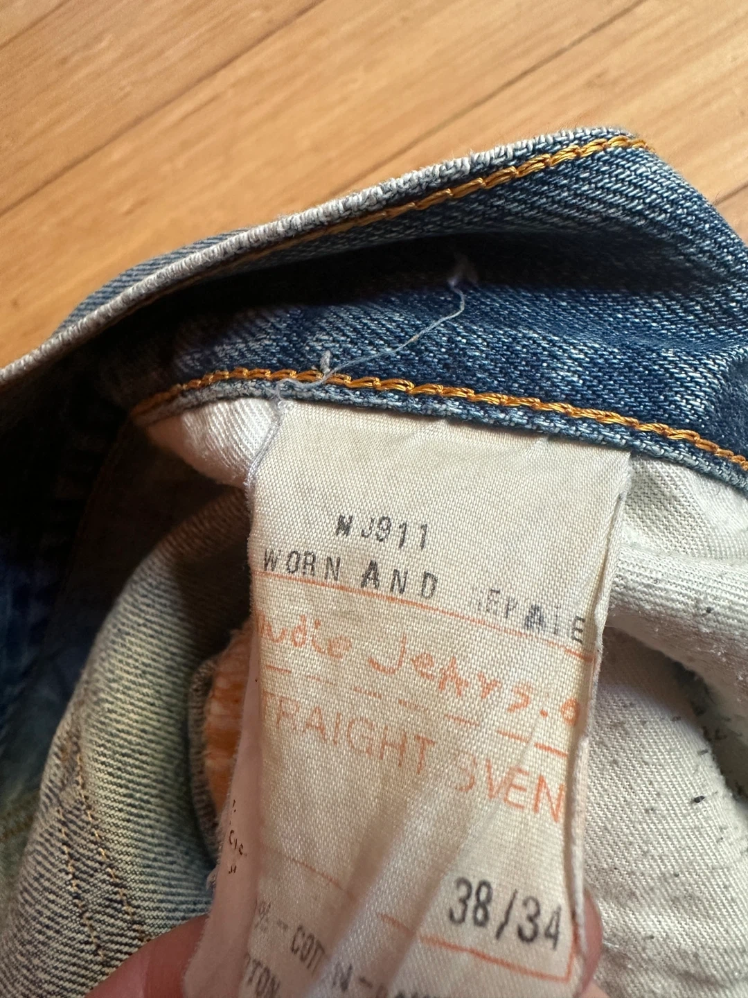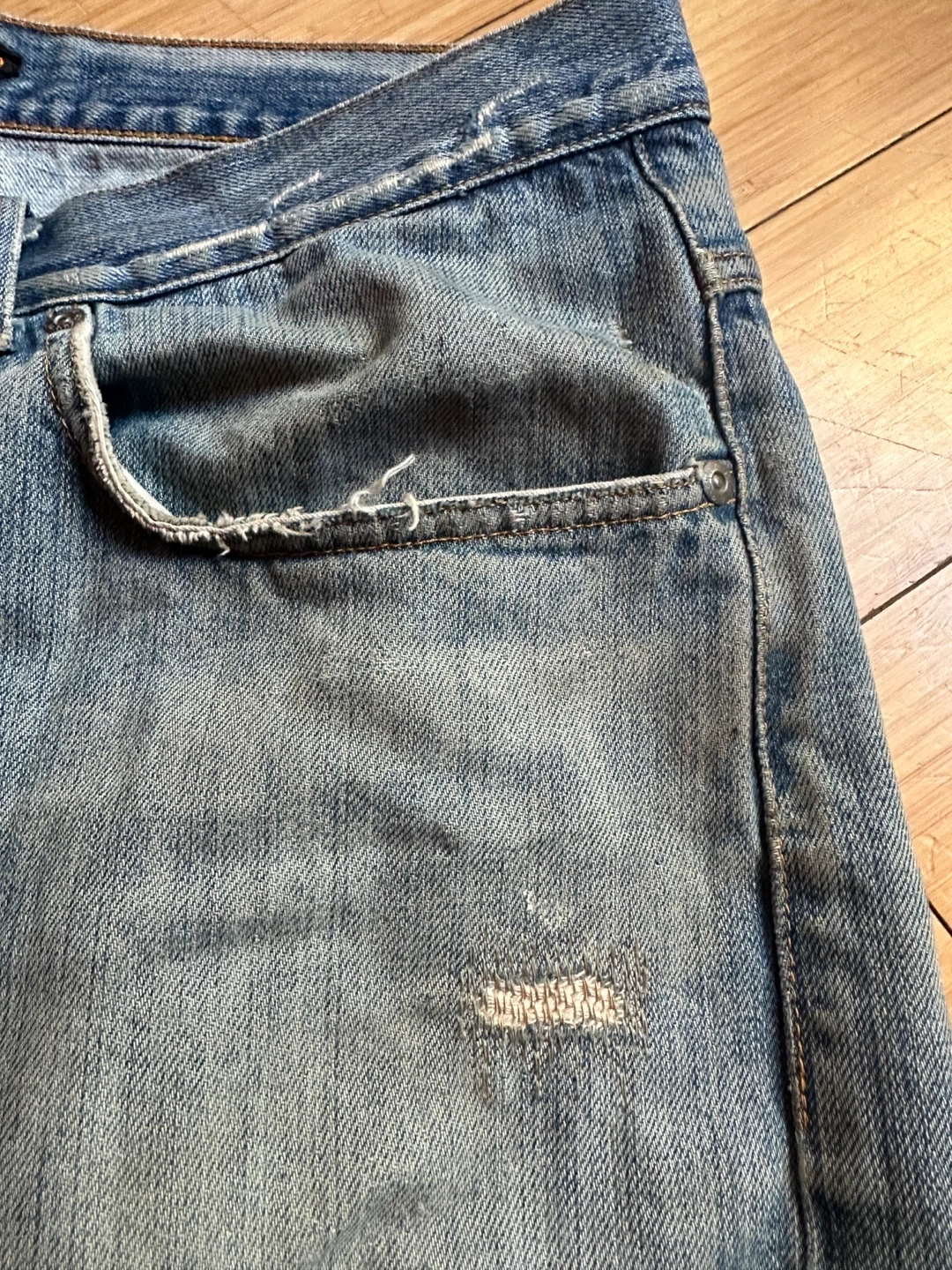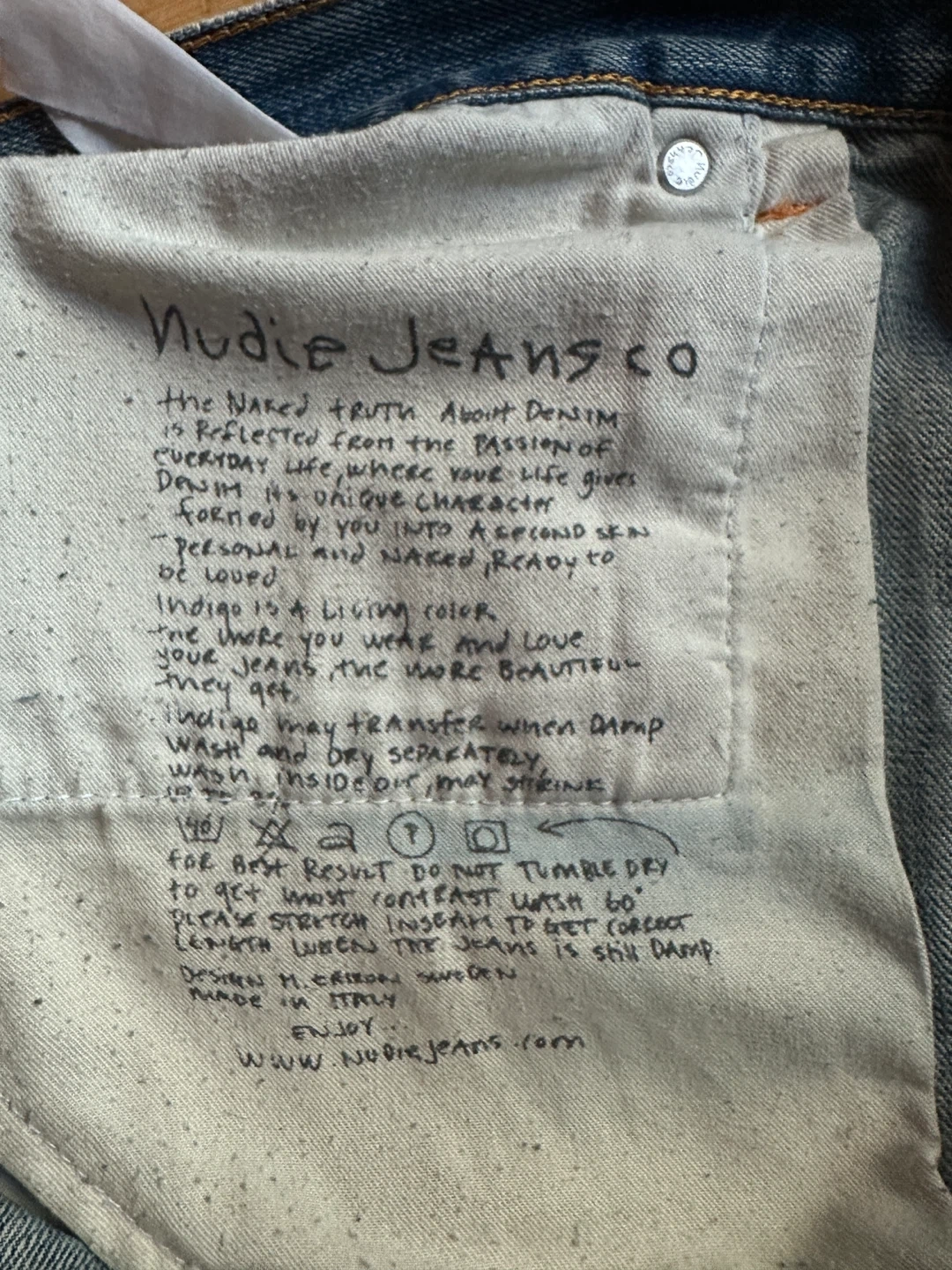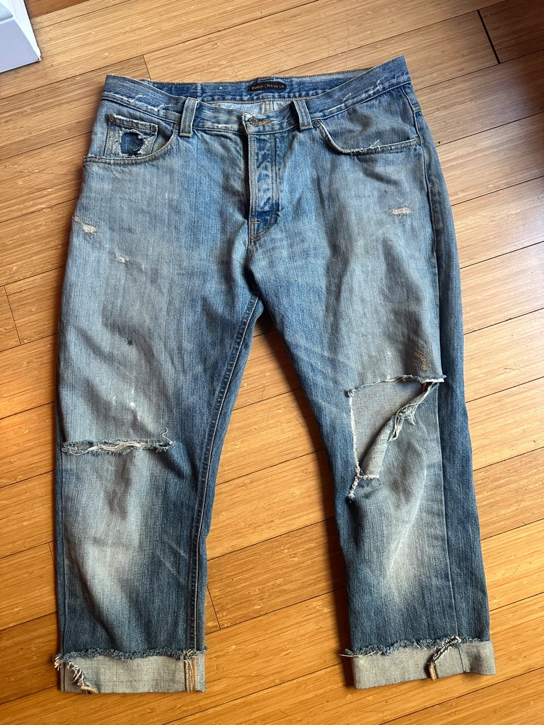 A super great pair of destroyed nudies with factory repair and distressing. No longer fit me. Baggy fit.