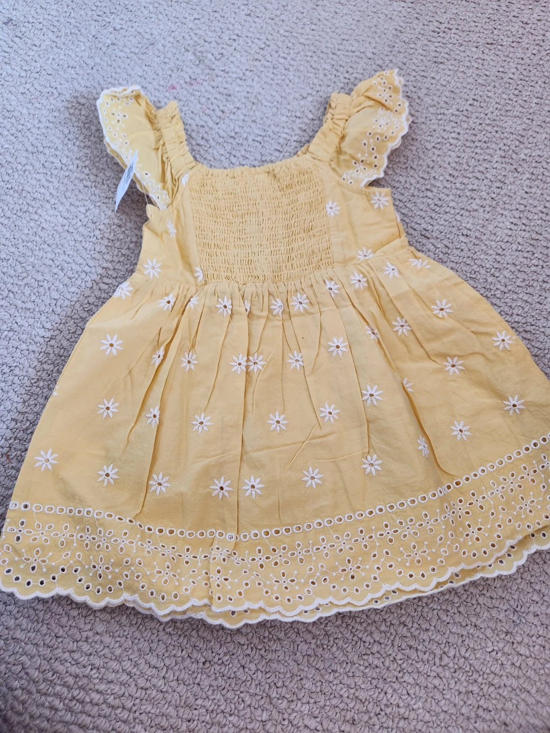 This adorable Old Navy dress is a sunny yellow with a sweet daisy print and eyelet trim. It features ruffled sleeves and a smocked bodice for a comfortable fit. Perfect for warm weather adventures!