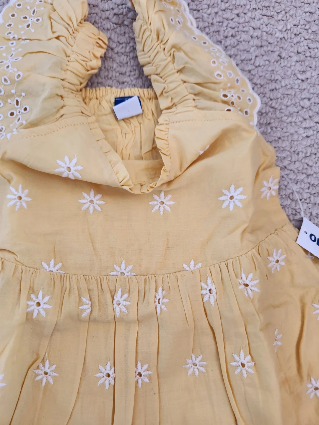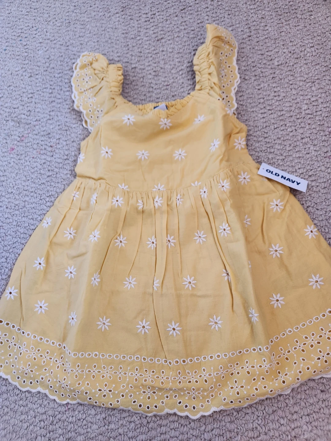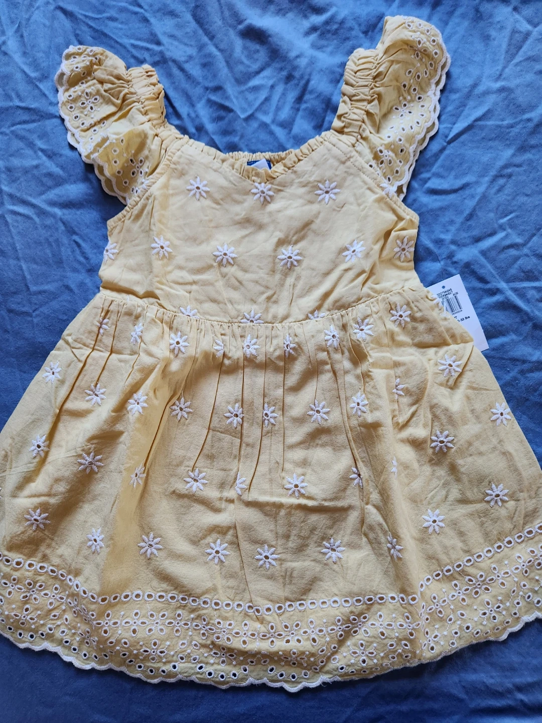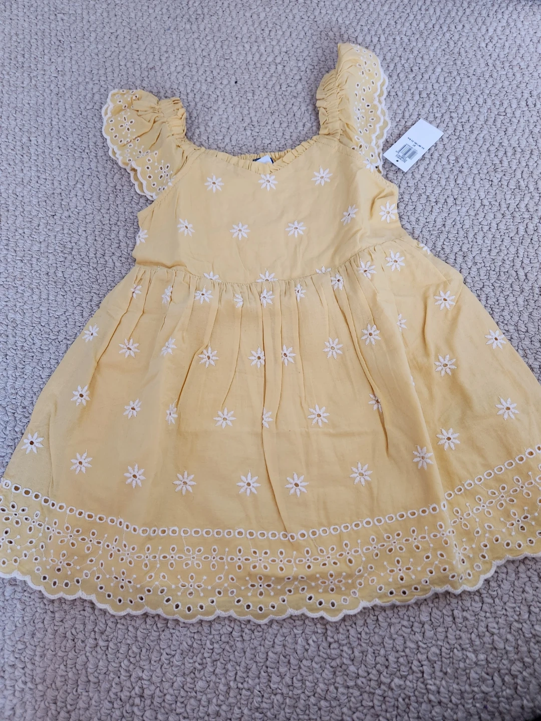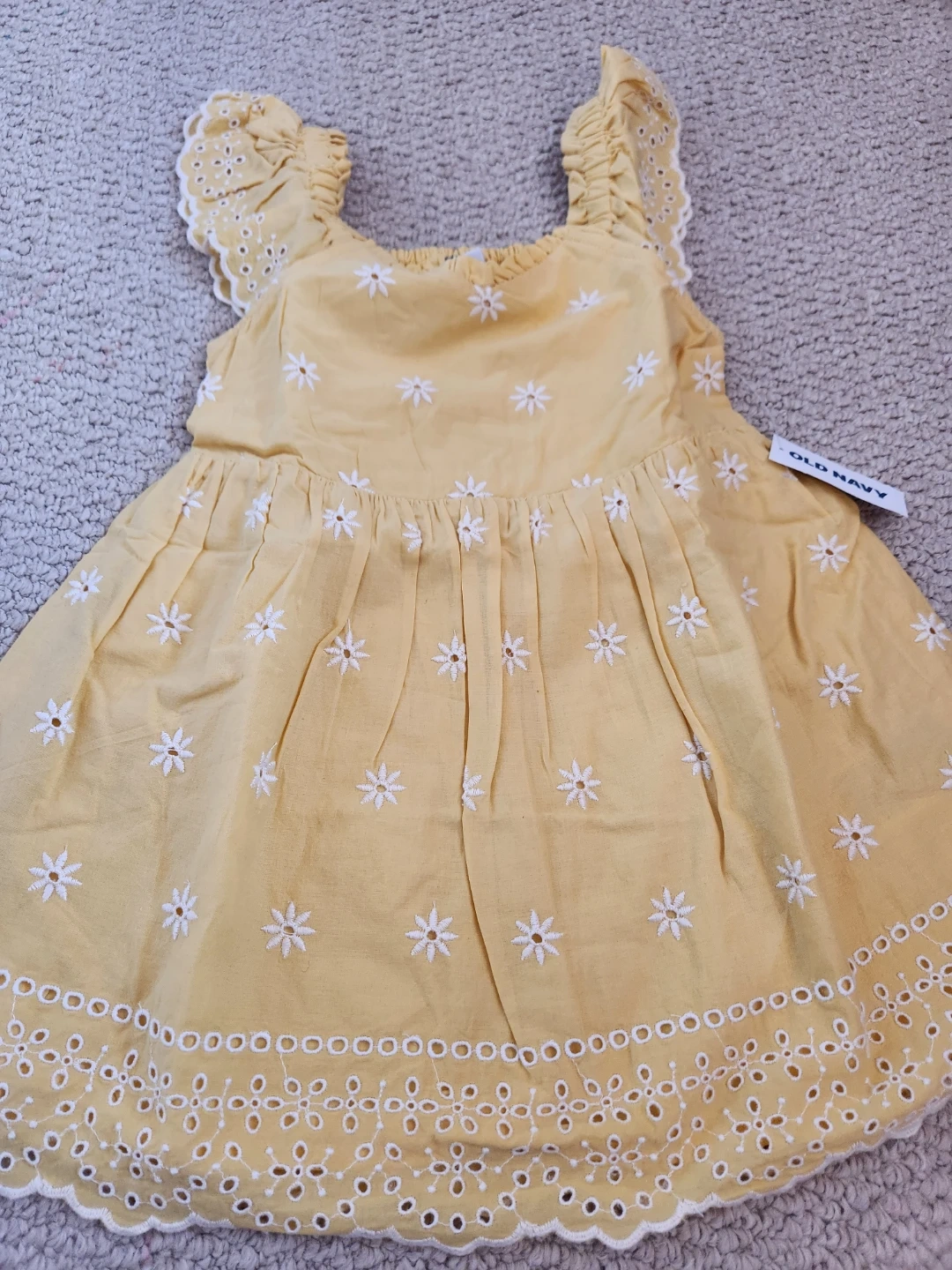 This adorable Old Navy dress is a sunny yellow with a sweet daisy print and eyelet trim. It features ruffled sleeves and a smocked bodice for a comfortable fit. Perfect for warm weather adventures!