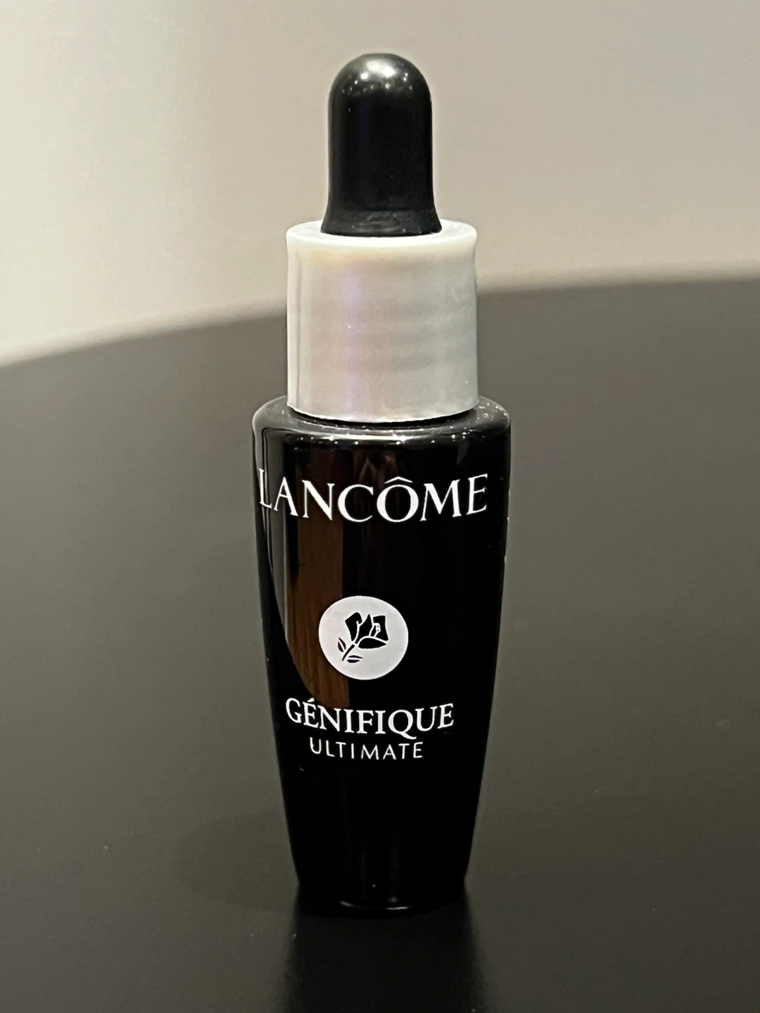 Lancome Génifique Ultimate serum. Sleek black bottle with white accents. Ideal for skincare routine. 12 ML bottle.