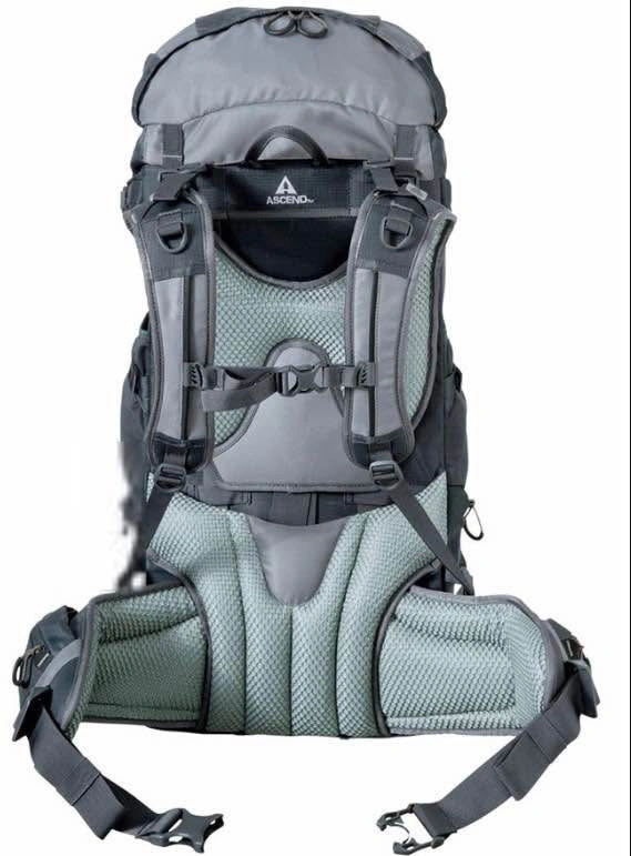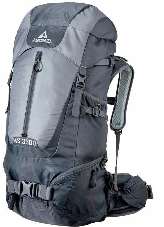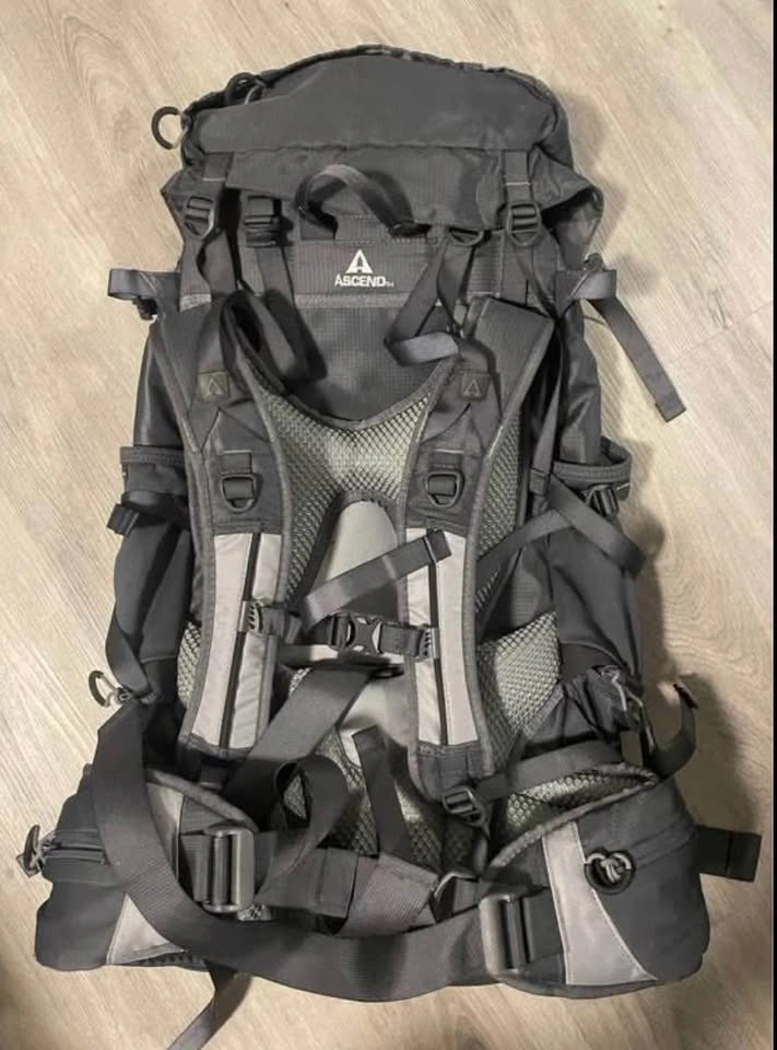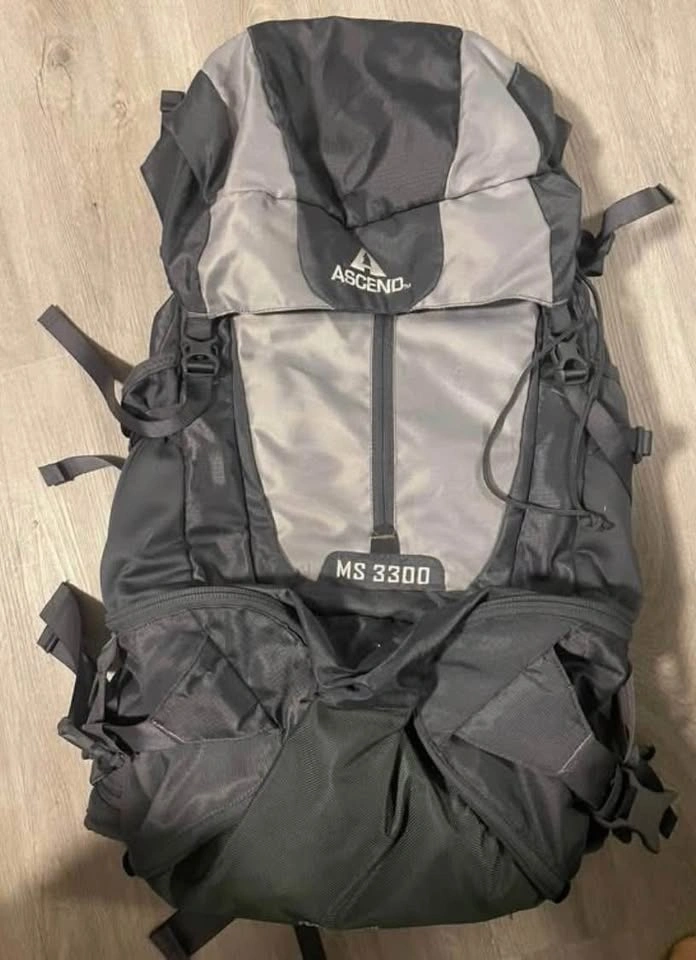89Sturdy multi-day backpacking pack in excellent condition. The Ascend MS3300 has a 54L capacity (3300 cu in), perfect for overnight or multi-day trips. Never used. Features: - Adjustable padded shoulder, hip, and chest straps for comfort - Internal frame with mesh back for ventilation - Multiple compression straps and gear loops - Top and side loading for easy access - Integrated rain cover in a zippered pocket - Durable fabric with no rips or major wear Pickup only (14th and Prince Edward).