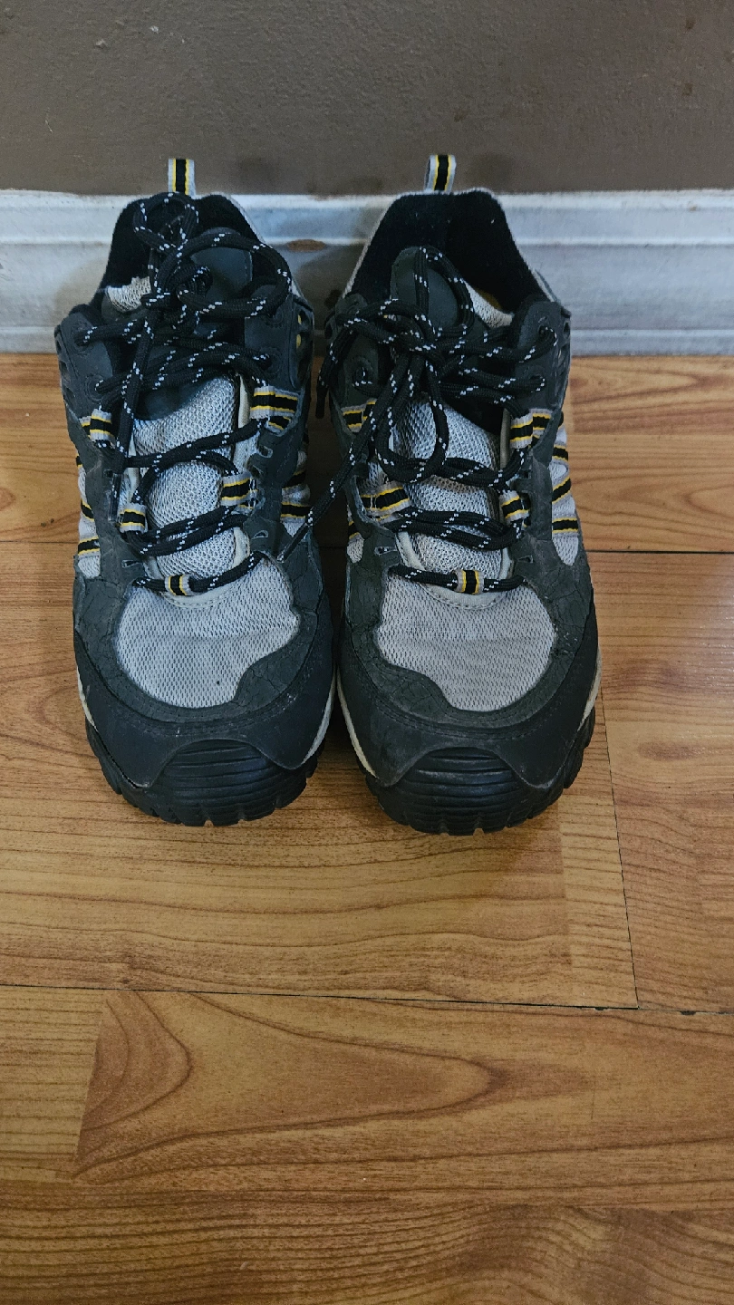 31Pair of Merrell hiking shoes in grey and black. They look like they've been used but still have lots of life left in them! Great for trails or just walking around town