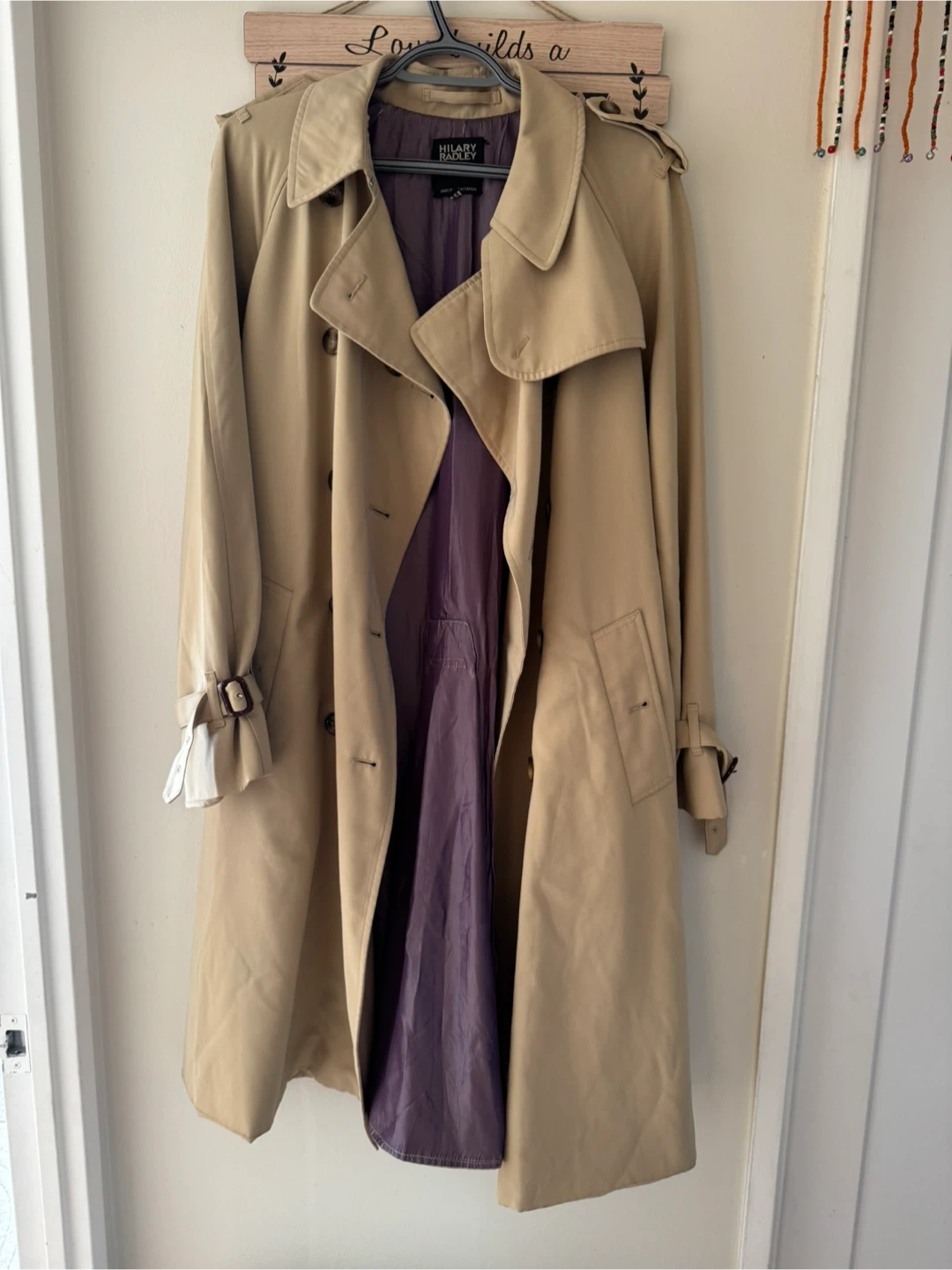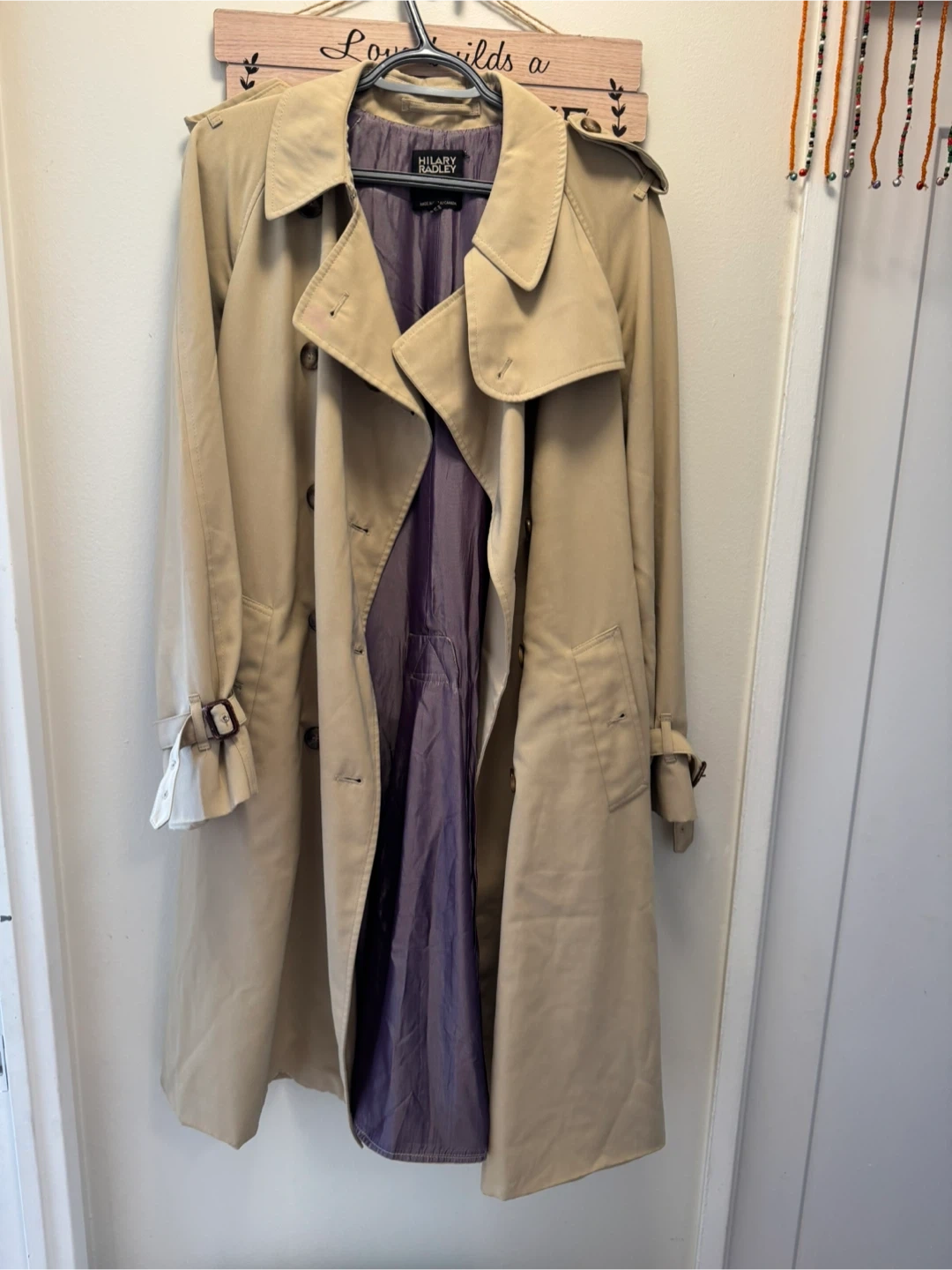 27Selling a classic beige trench coat from Hilary Radley! It's in great shape and ready for a new home. The coat features a stylish design with a belted waist and button details. Perfect for adding a touch of elegance to any outfit