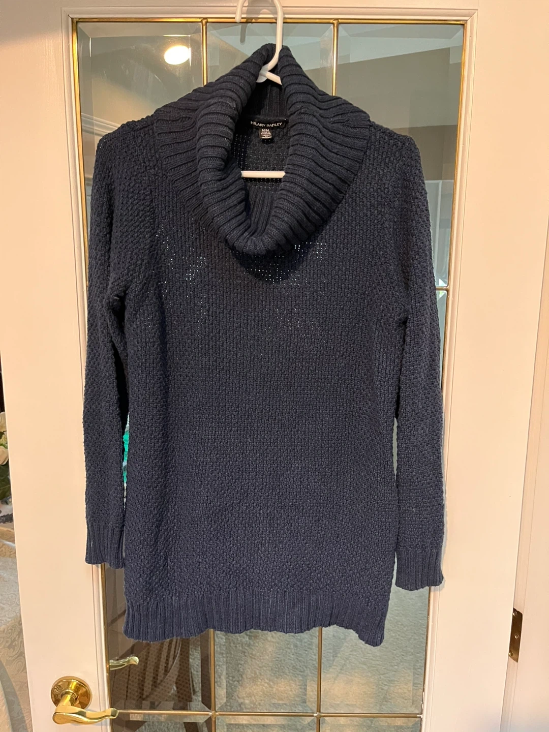 17Cozy up in this lovely Hilary Radley sweater! It's a beautiful blue colour with a stylish cowl neck. The size is M/M and the material is 70% cotton and 30% polyester, making it super comfy for those cooler days