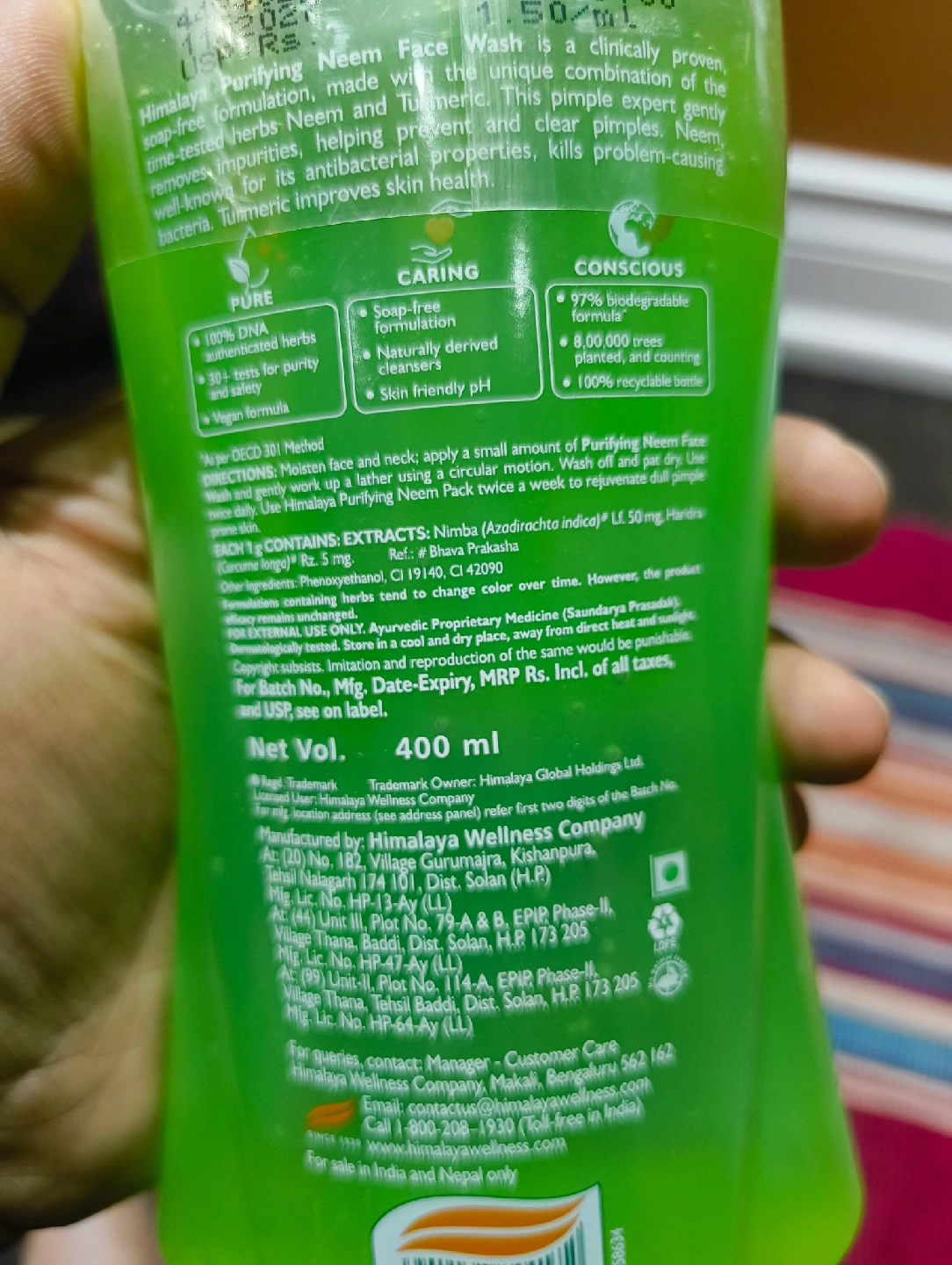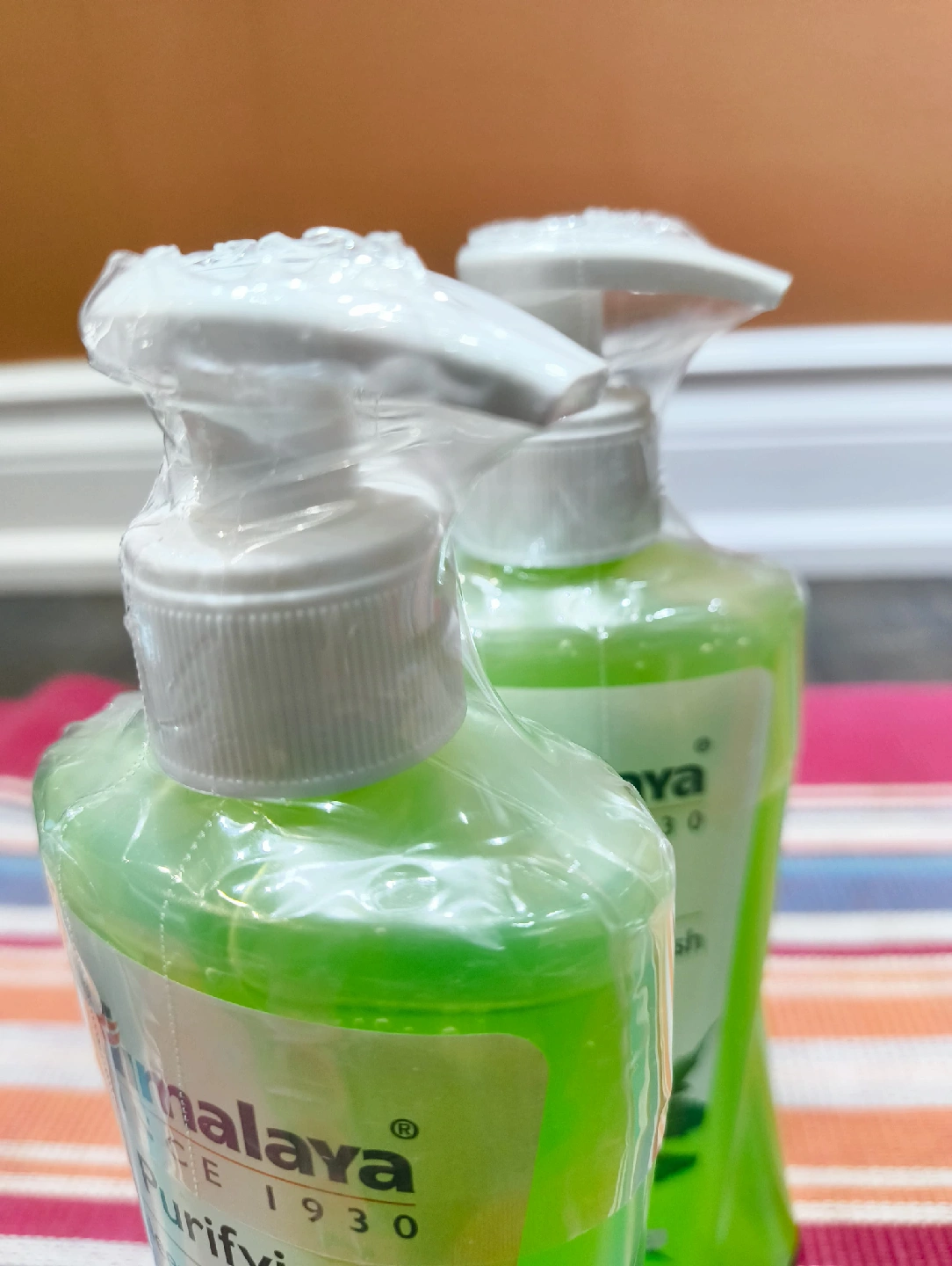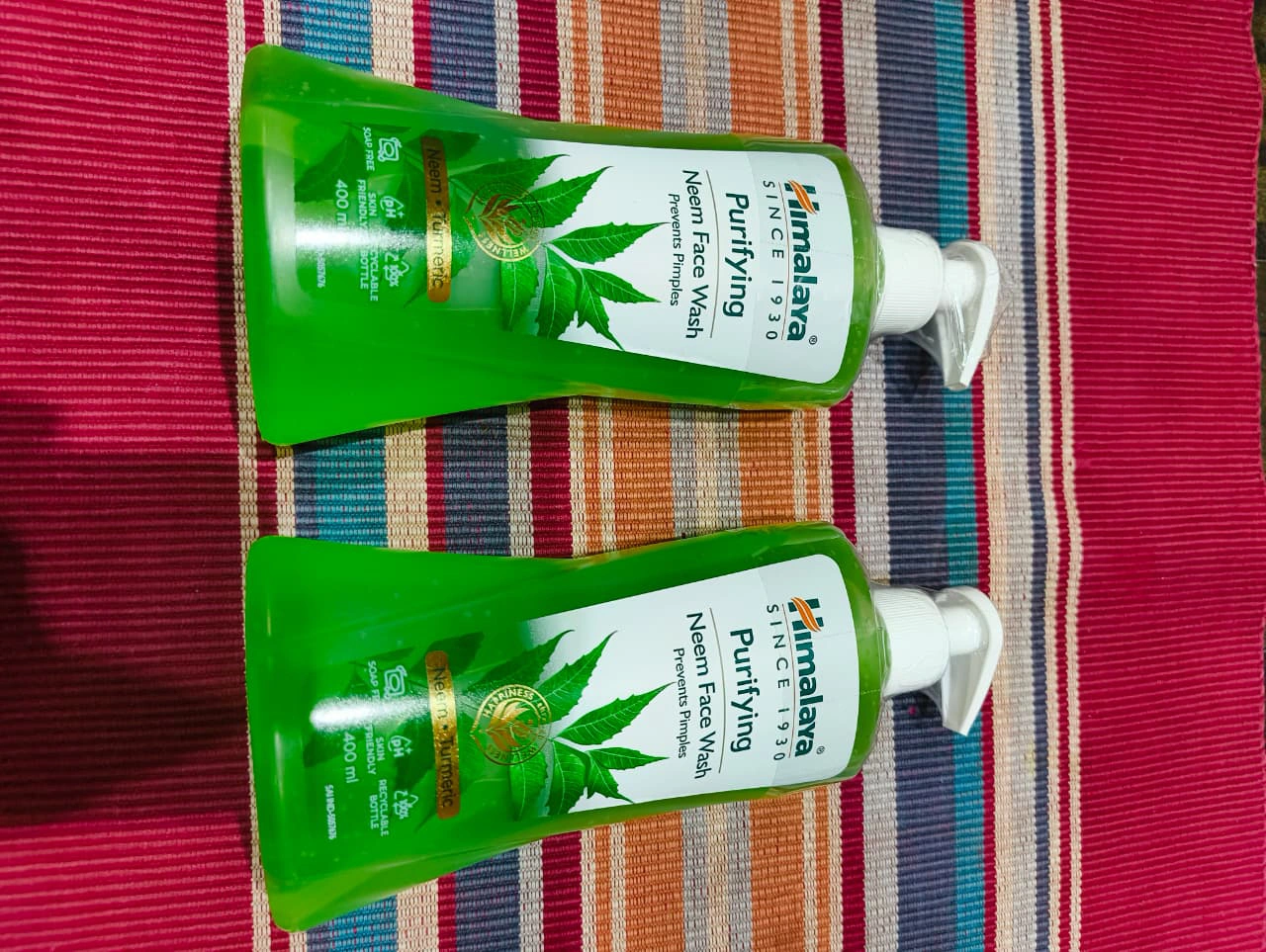 I have two bottles of Himalaya Purifying Neem Face Wash, each containing 400ml. This face wash is soap-free and skin-friendly. The bottle is also recyclable. It's formulated with neem and turmeric, known for their antibacterial properties, helping to prevent pimples. It's a great way to keep your skin clean and healthy!