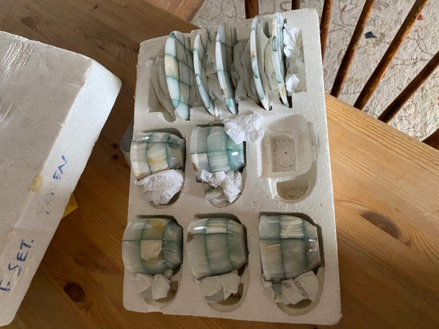 Set of six green onyx coffee cups and saucers. Green and white marbling pattern. Never been used, non smoking home. 3” tall sitting on saucer, cup 3” diameter, and saucer4 1/2” diameter. Will deliver within Oshawa, closest intersection Wilson and Rossland.
