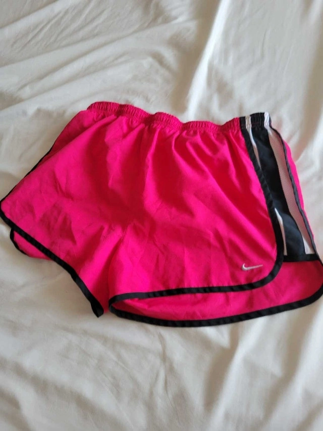 Get ready to sprint in style with these vibrant pink Nike running shorts, size medium, perfect for adding a pop of colour to your workout wardrobe. These shorts have a black and white stripe on the side. Showing some signs of use, but ready for a new home! Size: Medium Colour: Pink Brand: Nike