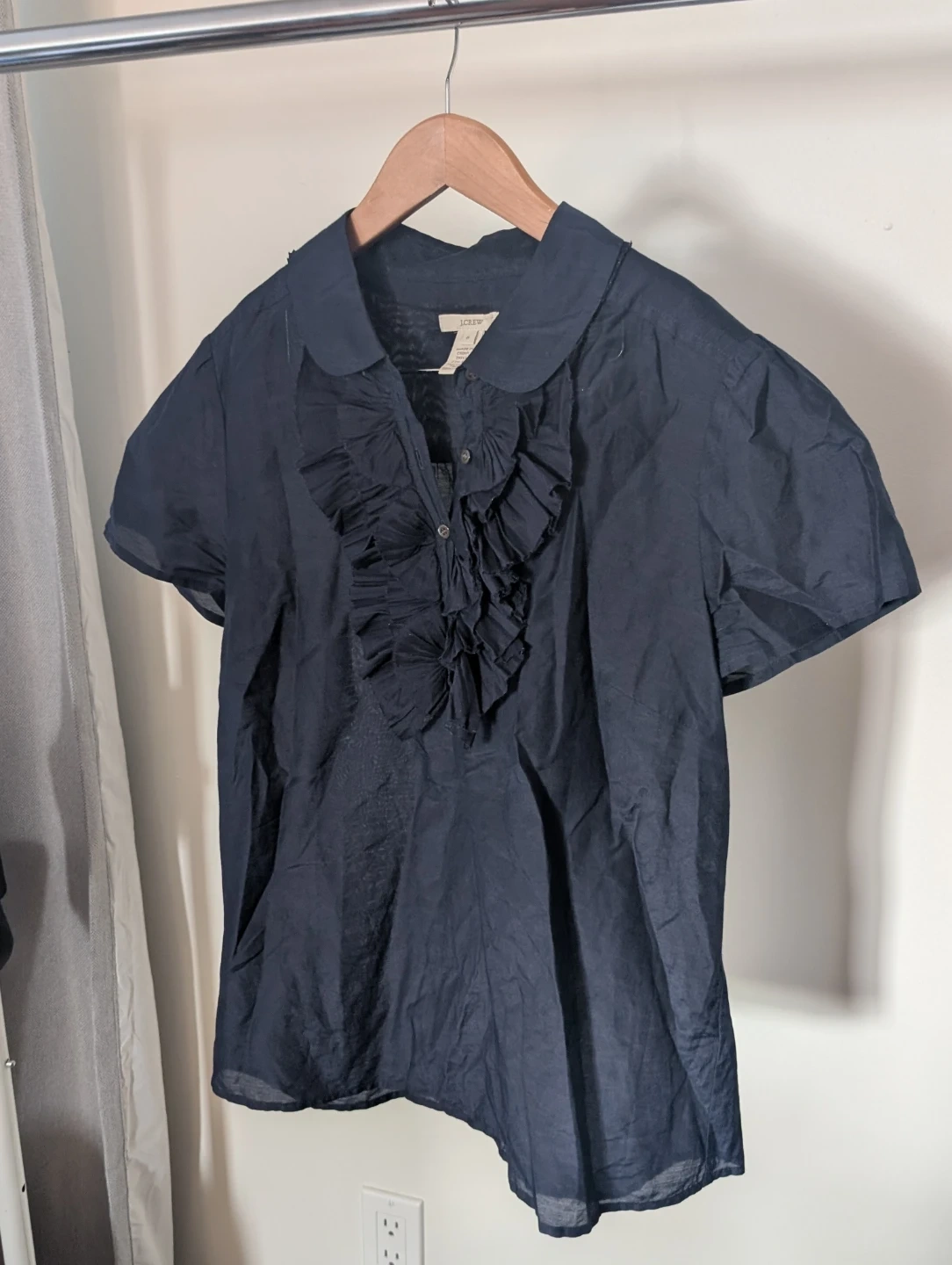 A navy blue J.Crew short-sleeve blouse with a ruffled front and a Peter Pan collar. Shell is 73% silk and 27% cotton, with trim made of 100% cotton. It's a size 6.