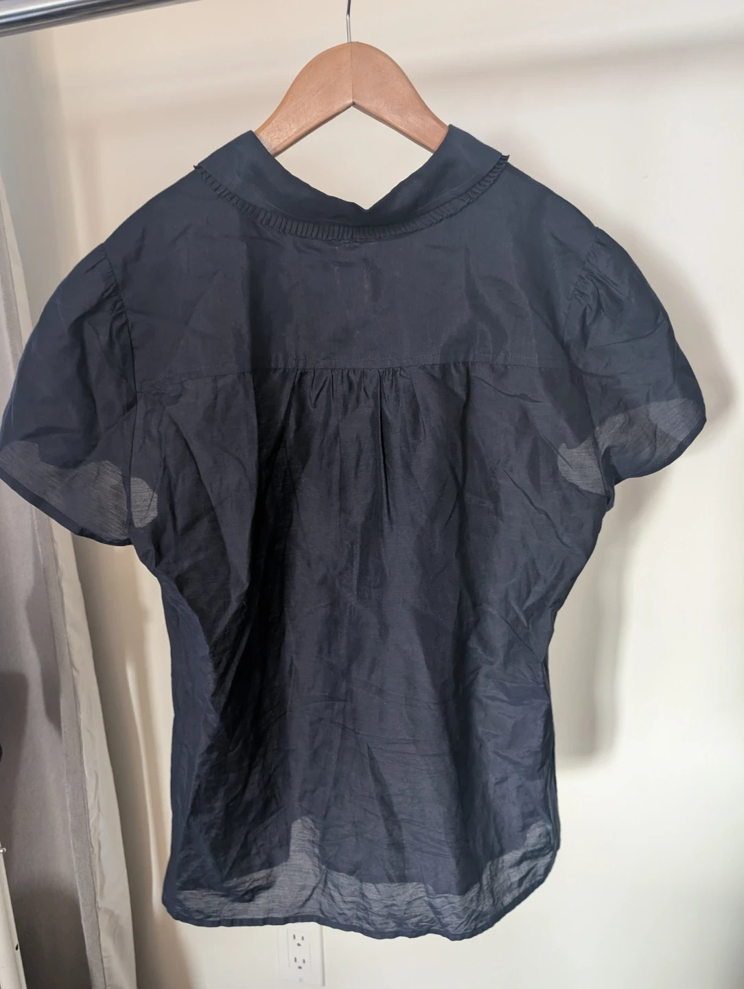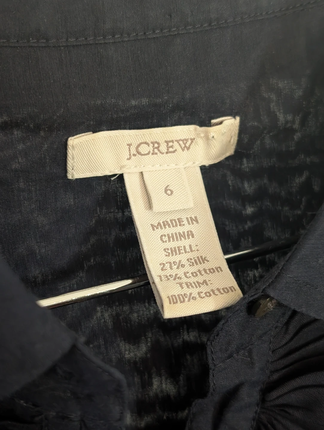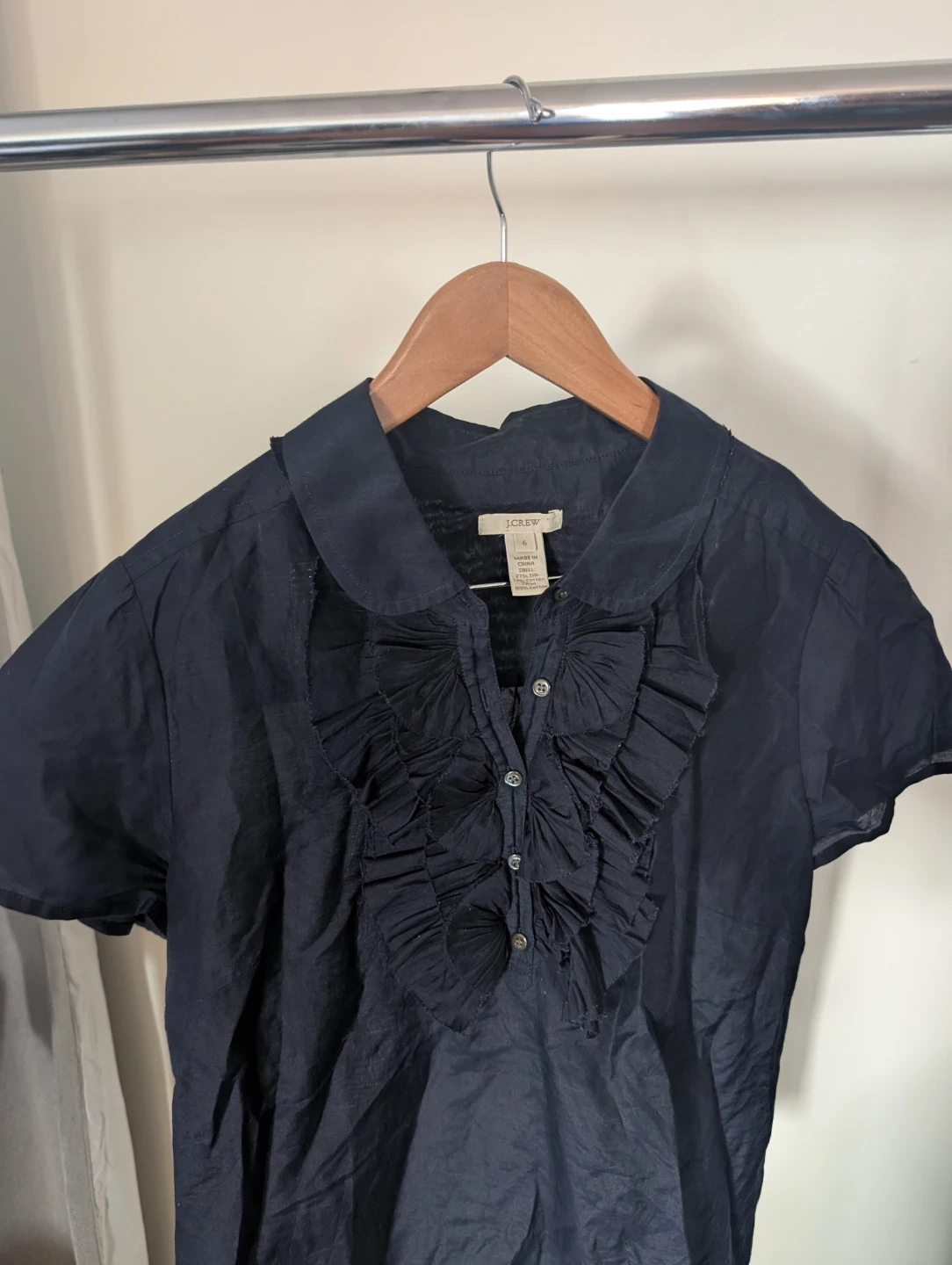 A navy blue J.Crew short-sleeve blouse with a ruffled front and a Peter Pan collar. Shell is 73% silk and 27% cotton, with trim made of 100% cotton. It's a size 6.