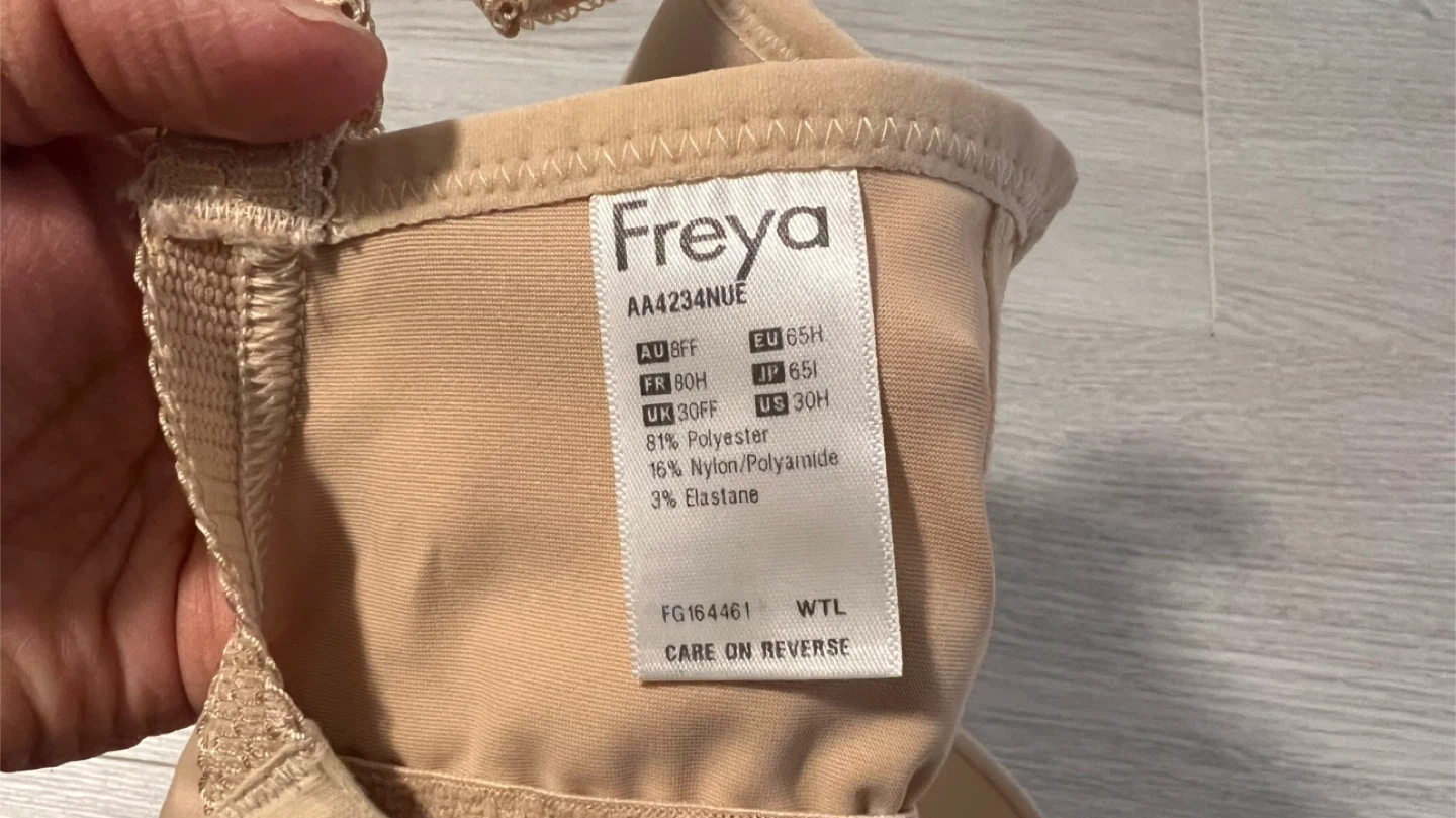Buy & SellFreya Bra Size 30H NudeFreya Bra Size 30H Nude$10This is a Freya bra in a nude colour. It's made with 61% polyester, 16% nylon/polyamide, and 3% elastane. The bra is a size 30H in UK sizing.ConditionLike newBrandFreyaWHERE TO MEETCheck LocationView MapSELLERverifiedFelixThornhill15910 reviews0 chats·0 favorites·21 viewsSEND CHAT TO SELLERHi Felix! I’m interested in your listing.Hi Felix! I’m interested in your listing.Get the Karrot app to chatSign In to chat