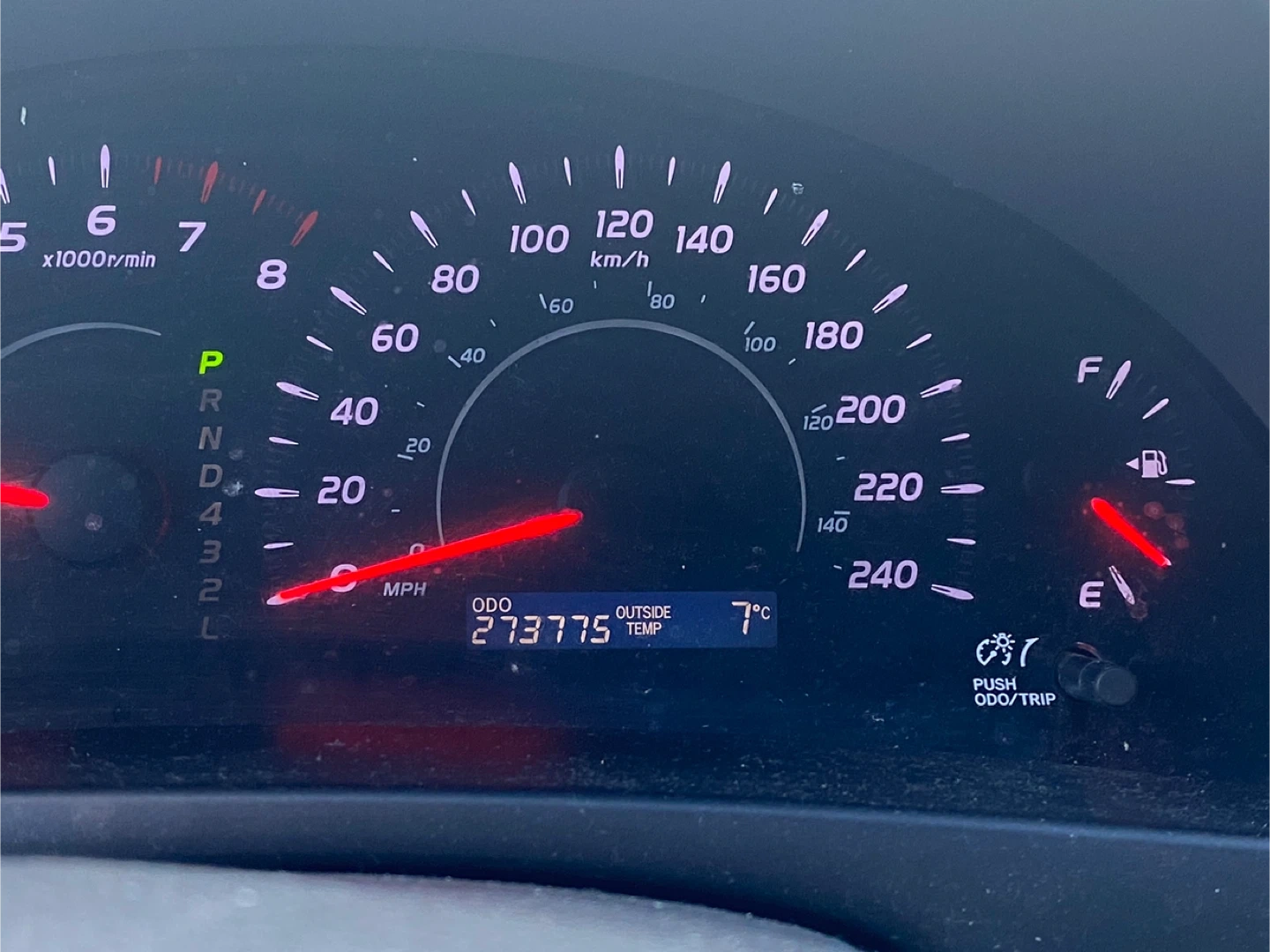 This is a gold Toyota Camry sedan. It's been safety certified and has 273,775 km on it. It runs well and is ready for a new owner.