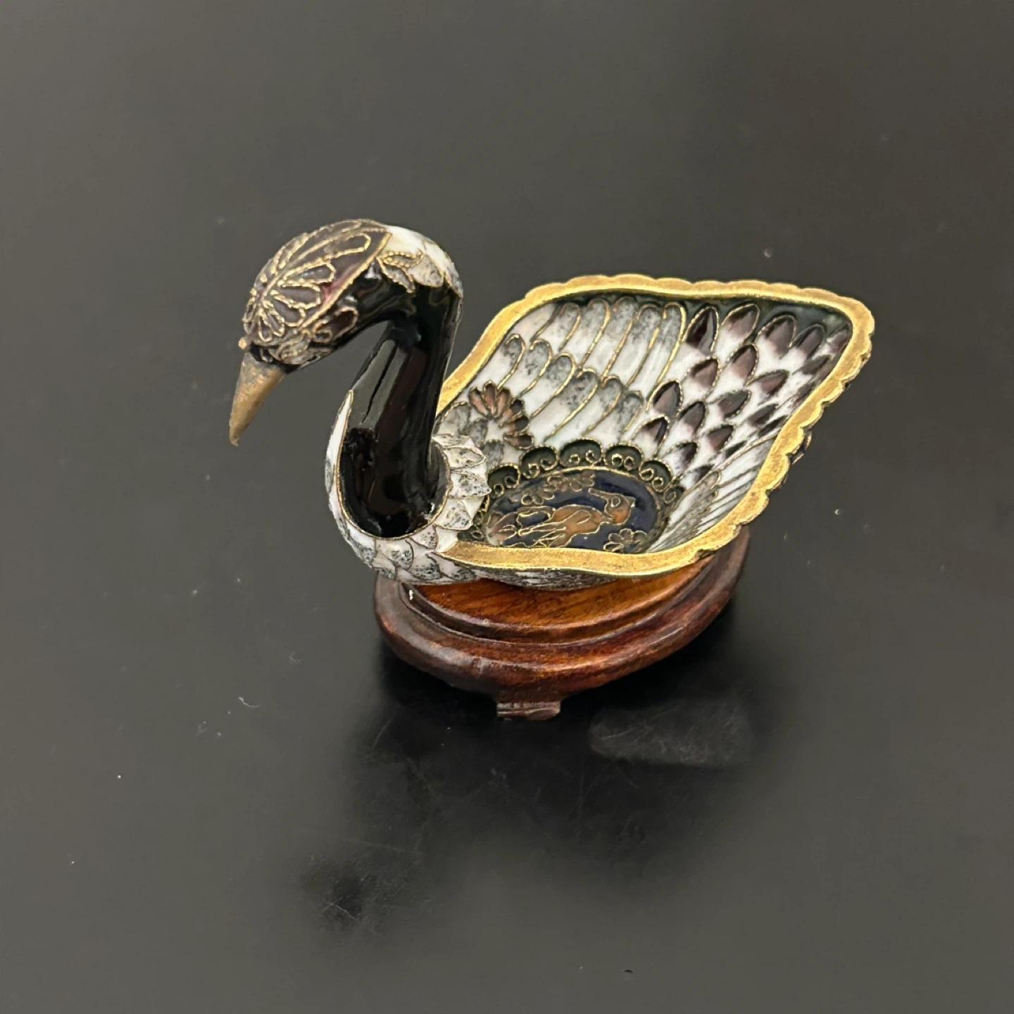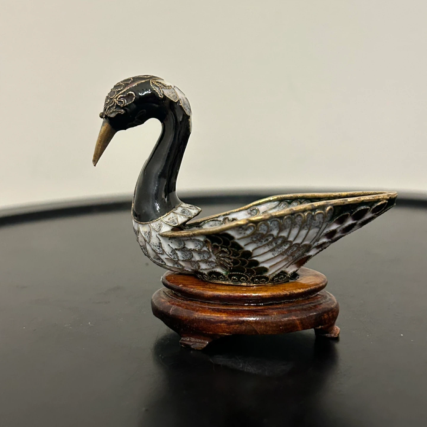 A beautiful vintage cloisonné swan trinket dish, crafted in the traditional Chinoiserie style. This elegant piece features fine brass wirework (cloisons) filled with rich enamel in white, black, and deep burgundy/plum tones. The wings are detailed with a textured “feathered” pattern, and the interior bowl showcases a delicate enameled bird motif — a charming and less common decorative touch.